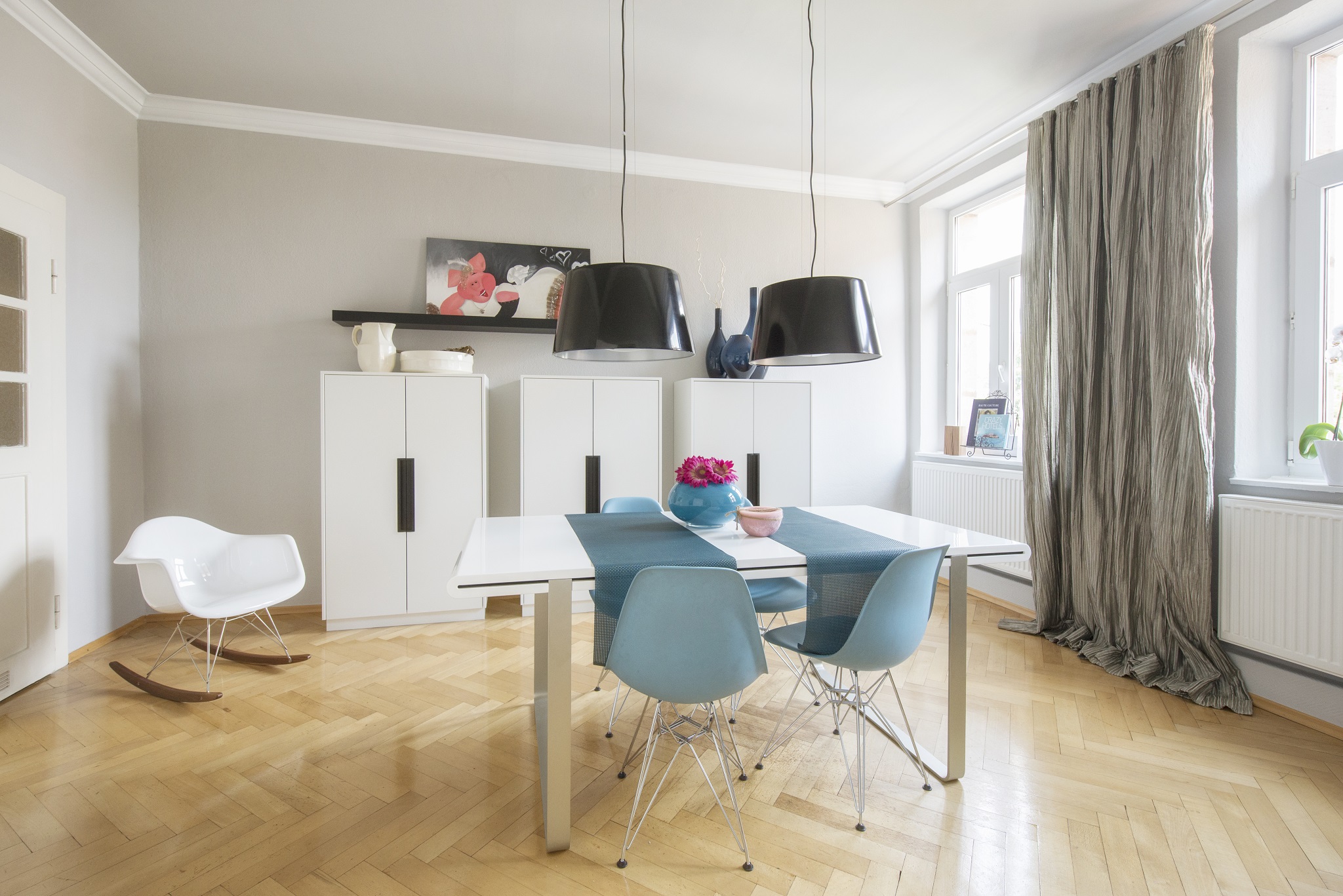 Weich fließende schwere Stoffe schaffen Harmonie. Außerdem verdecken sie Zuleitungen der Altbau-Heizung sowie zahlreiche Steckdosen und sorgen nebenbei für bessere Raumakustik. Die großen Pendelleuchten stammen von Ikea. Dieses Konzept der Innenarchitektur schafft es, die Jugendstil-Architektur gekonnt mit modernem Mobiliar zu bestücken.