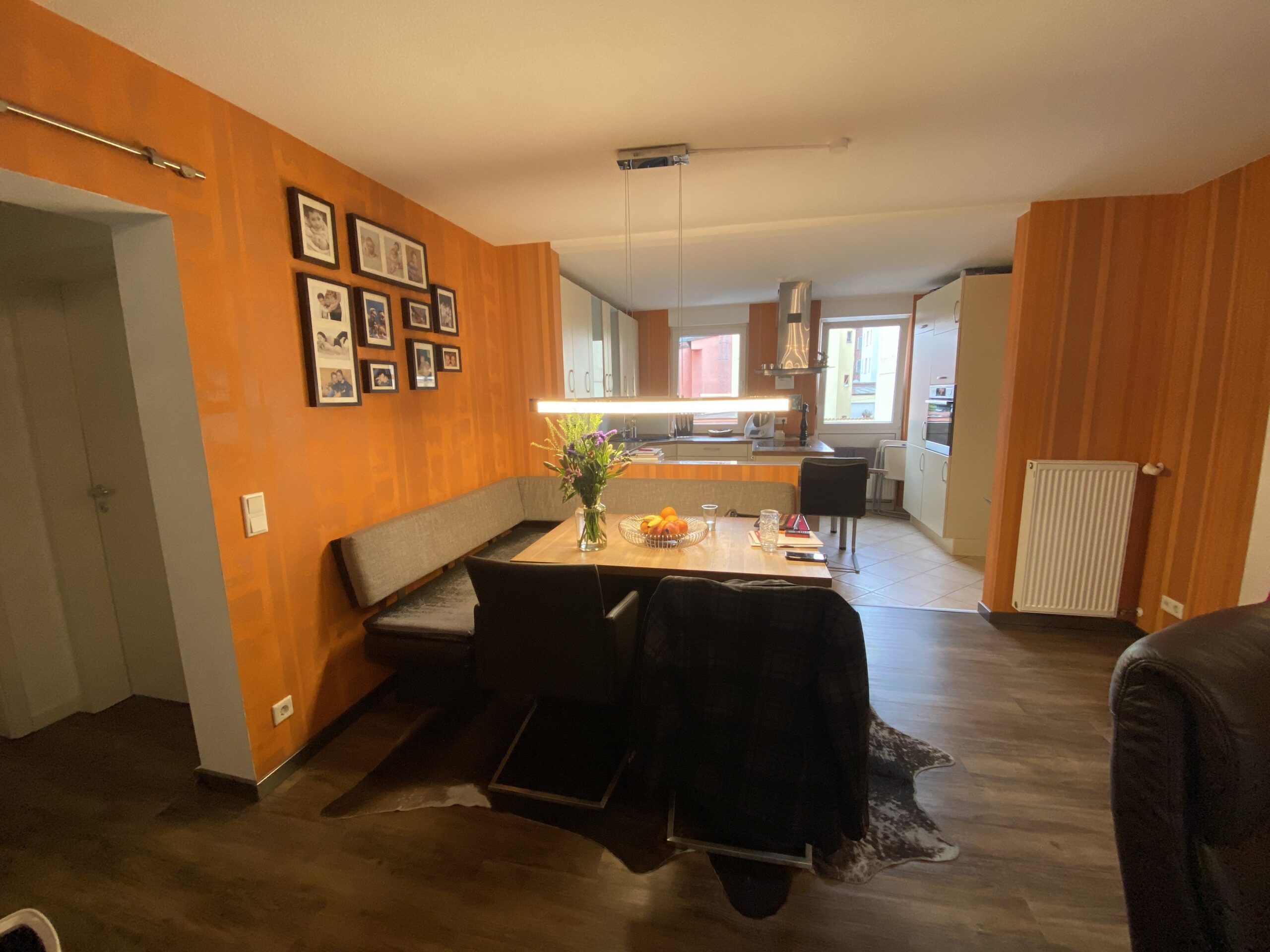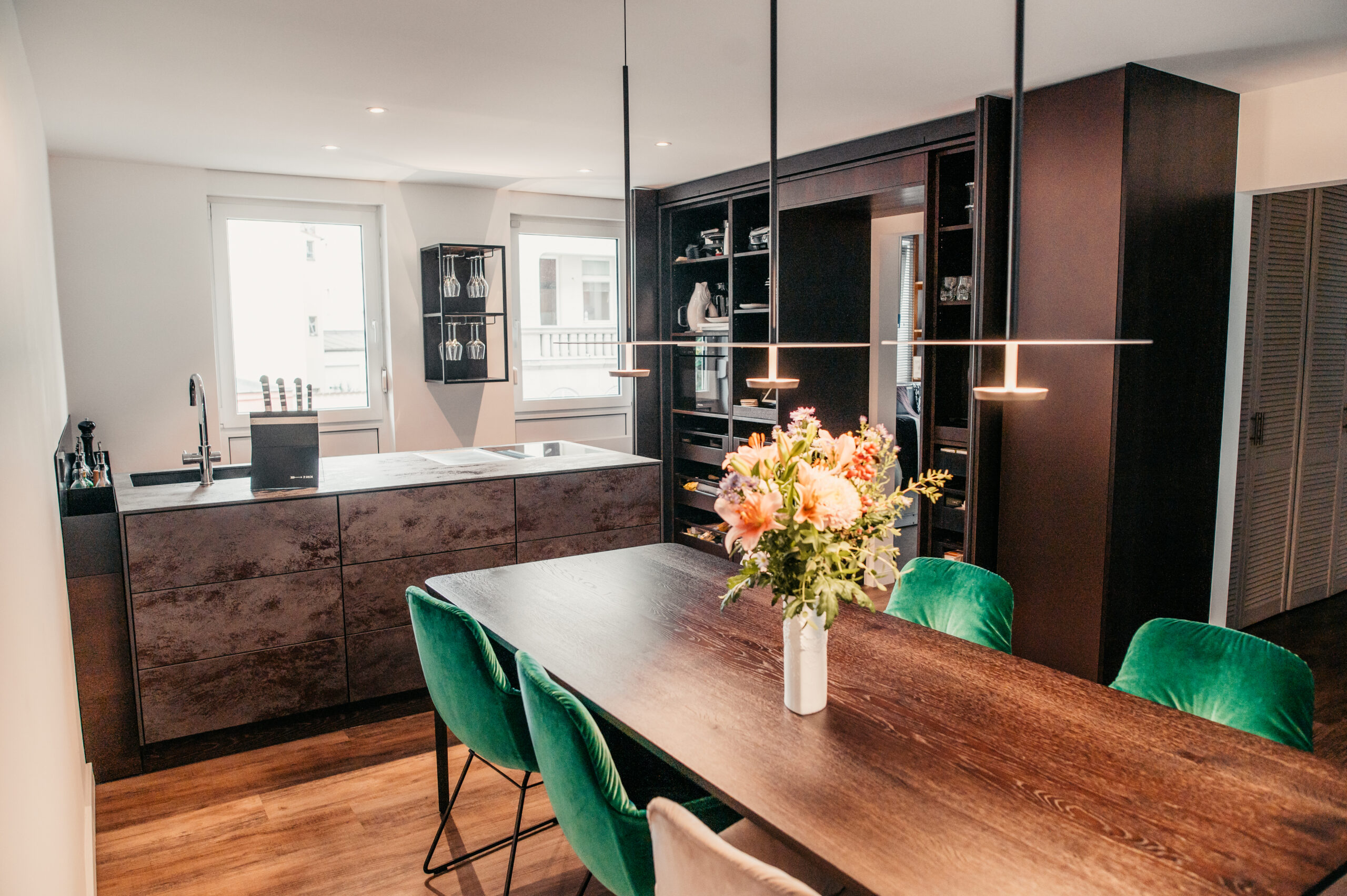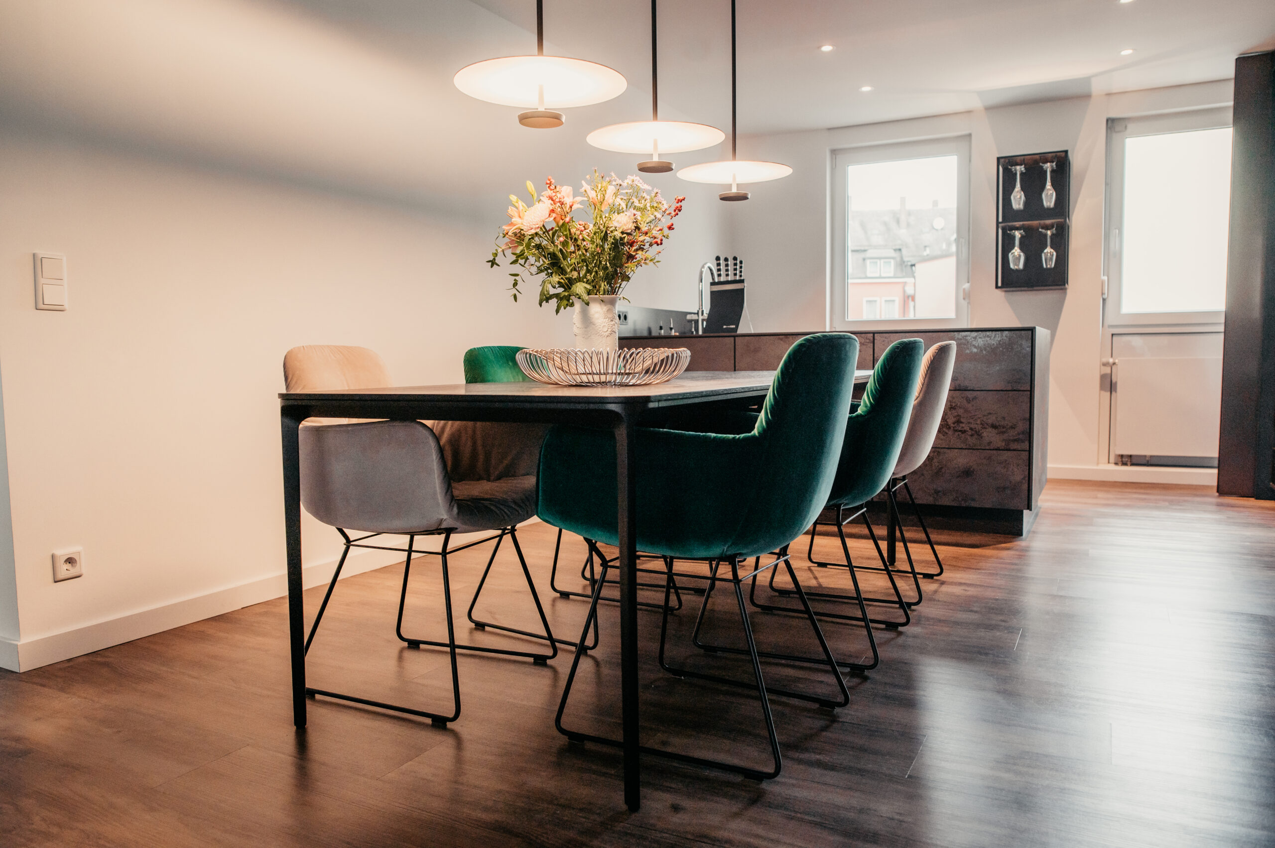 “Exklusive Materialauswahl in einer Wohnküche”. Man erkennt den Raum kaum wieder. Über eine abgehängte Decke konnten wir die Decke im Küchenbereich clean halten. Der Esstisch ist zwar keine lange Tafel, jedoch können hier 8 Personen bequem dran sitzen, was der Familie ausreicht. Die Farbauswahl bei den Stühlen bringt Pfiff in die Gestaltung. Toll sind die an zwei gegenüberliegenden Wänden gespiegelten hochwertigen italienischen Tapeten aus der gleichen Motivserie.