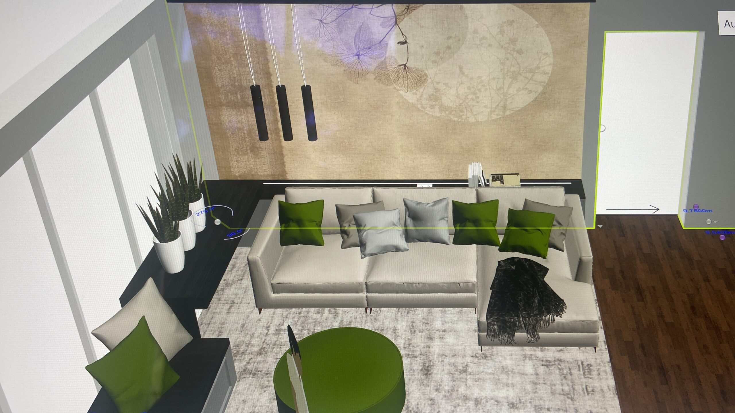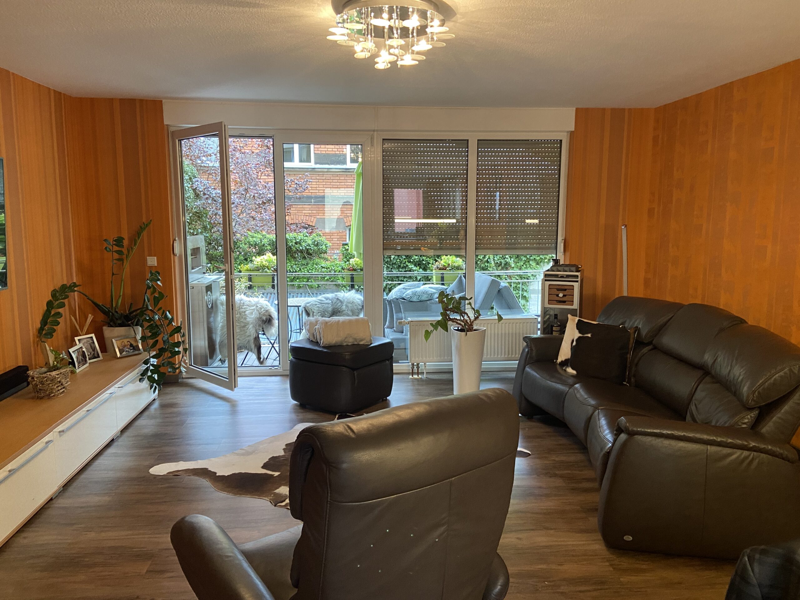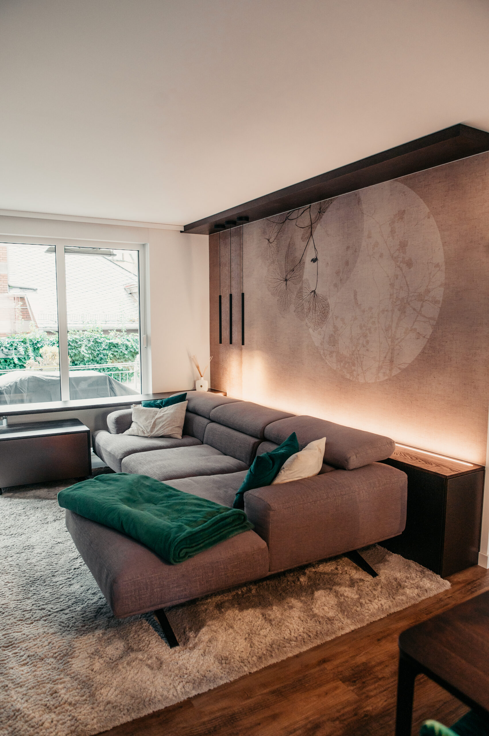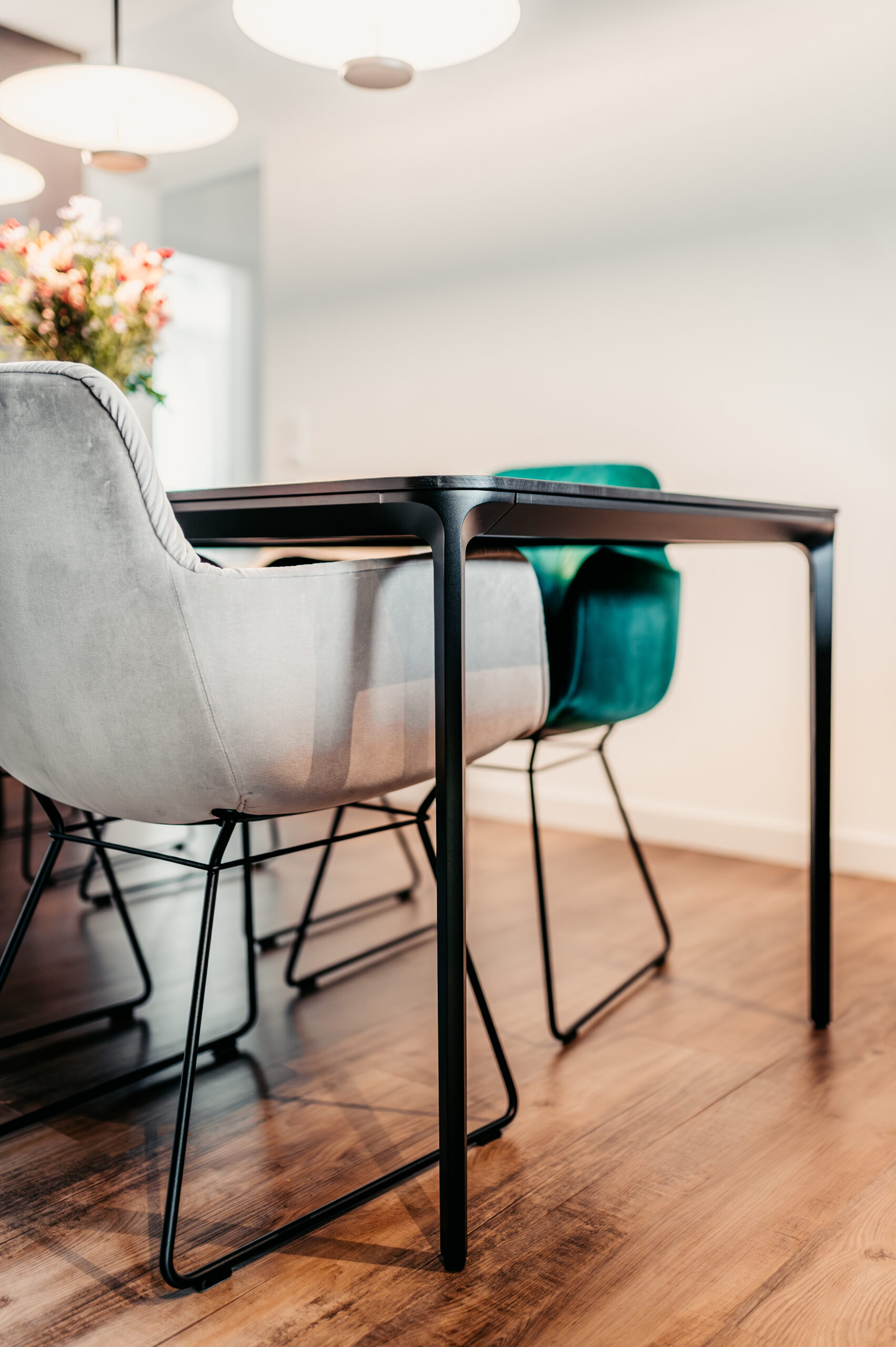 “Exklusive Materialauswahl in einer Wohnküche”. Man erkennt den Raum kaum wieder. Über eine abgehängte Decke konnten wir die Decke im Küchenbereich clean halten. Der Esstisch ist zwar keine lange Tafel, jedoch können hier 8 Personen bequem dran sitzen, was der Familie ausreicht. Die Farbauswahl bei den Stühlen bringt Pfiff in die Gestaltung. Toll sind die an zwei gegenüberliegenden Wänden gespiegelten hochwertigen italienischen Tapeten aus der gleichen Motivserie.
