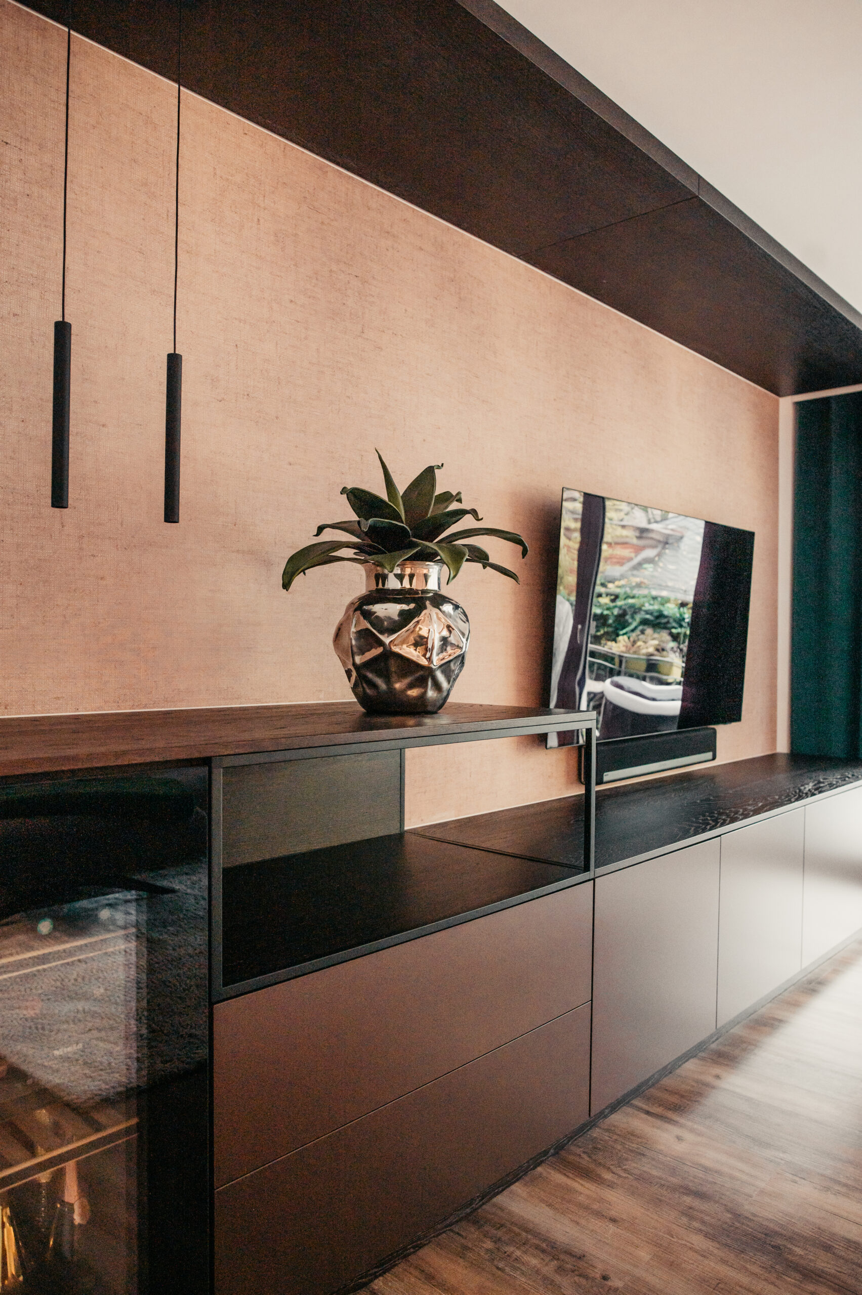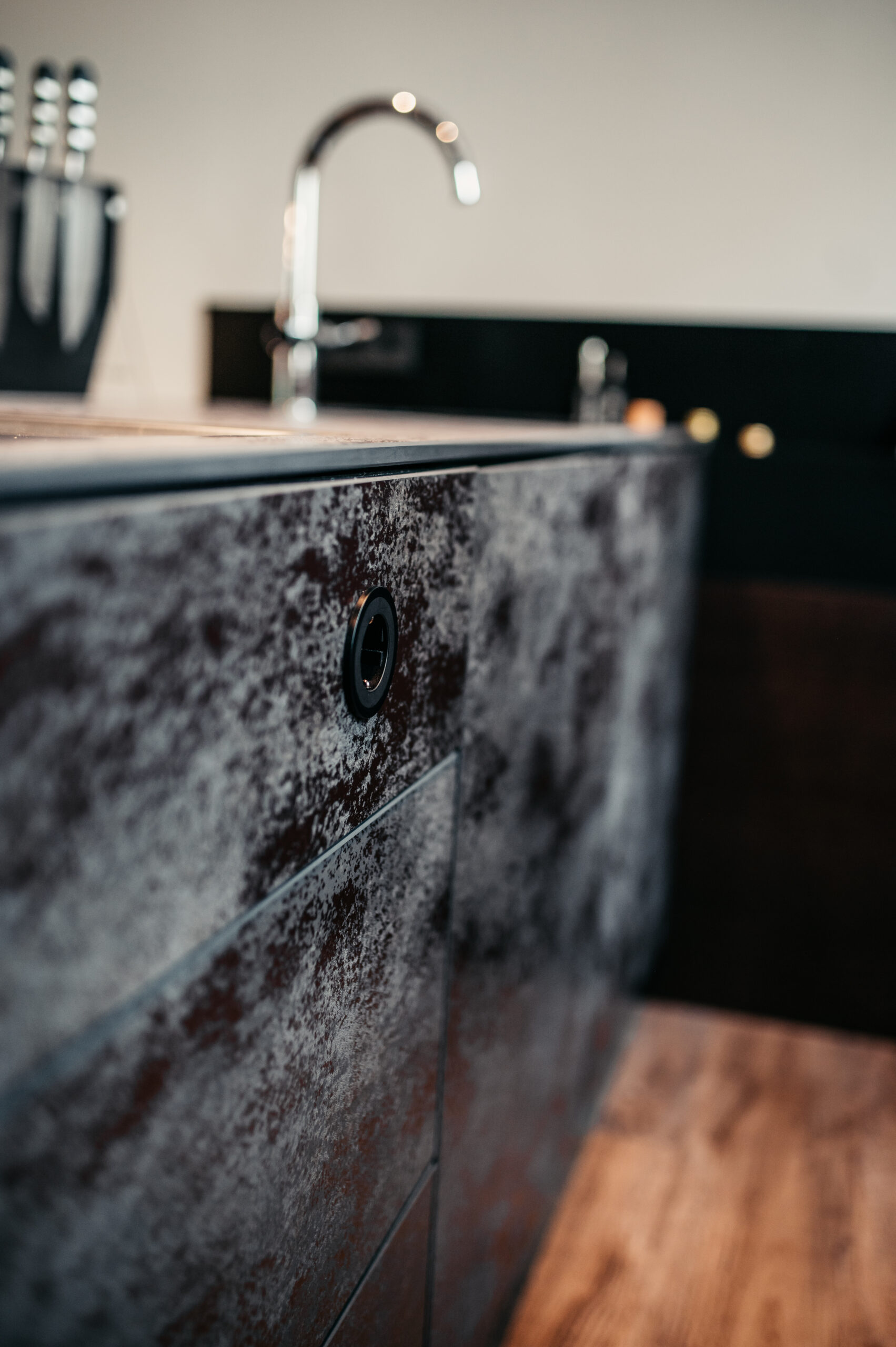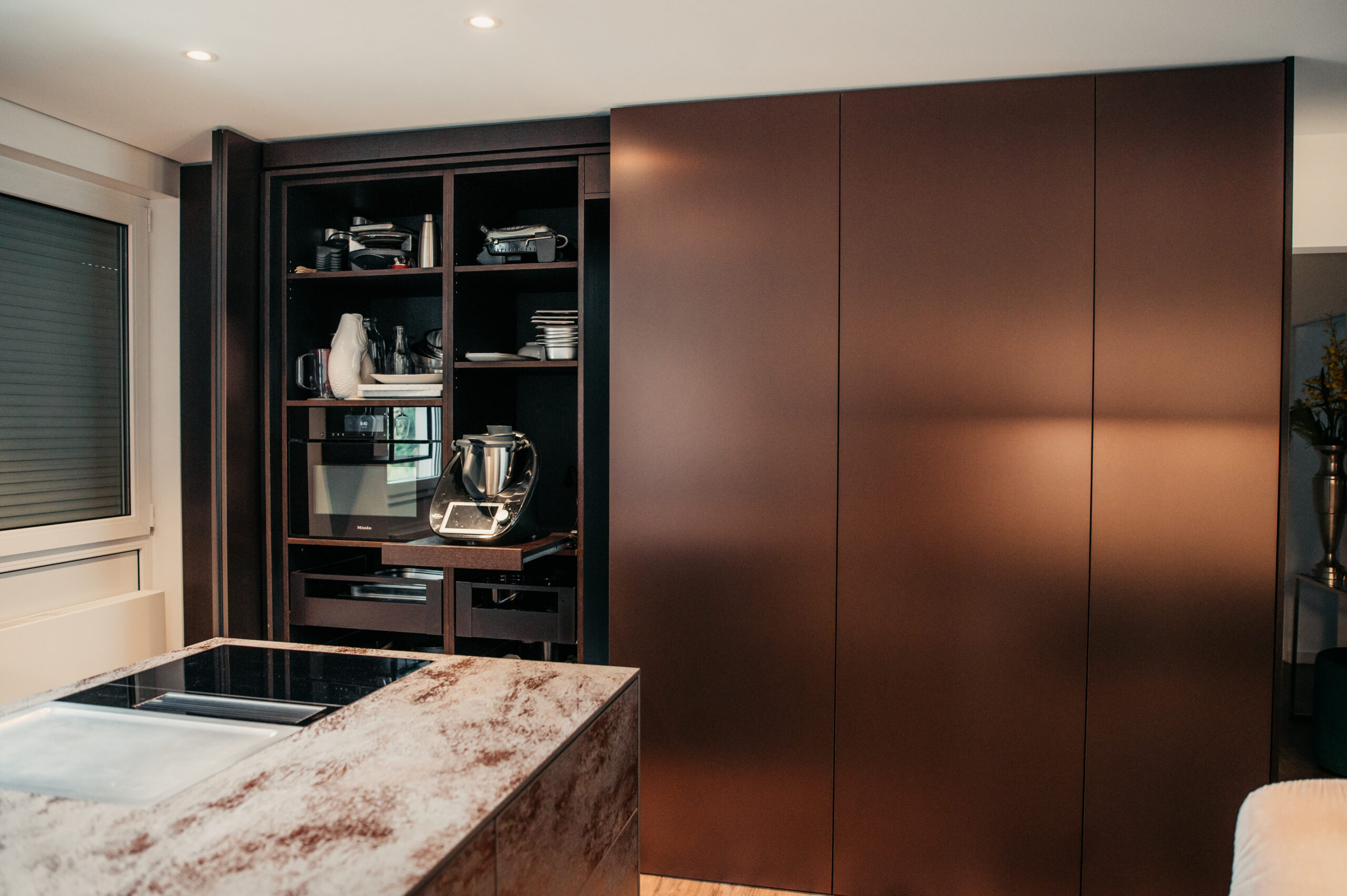 Was in diesem Projekt hervorsticht, ist die extrem hochwertige Material-Zusammenstellung, die Details bei den Küchenschränken und ganz besonders der versteckte Zugang zur angrenzenden Abstellkammer.