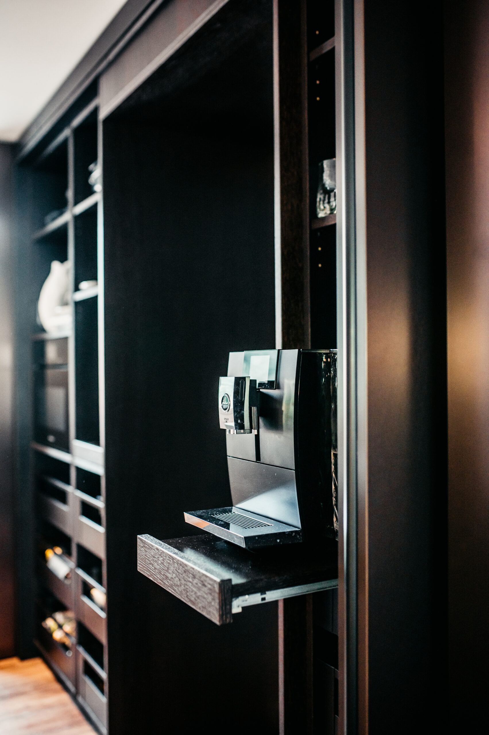 Auch begeistern die hinter Türen auf Tablar-Auszügen verstauten Elektro-Geräte, auf die man nun ohne lästigen Kabelsalat einfachen Zugriff hat. Das Resultat begeistert vor allem durch die kleinen hochwertigen Details, ein perfektes Lichtkonzept und eine wahnsinnige Schlichtheit. Wenn die Küchenschränke geschlossen sind, ist die Küchenzeile kaum wahrzunehmen.