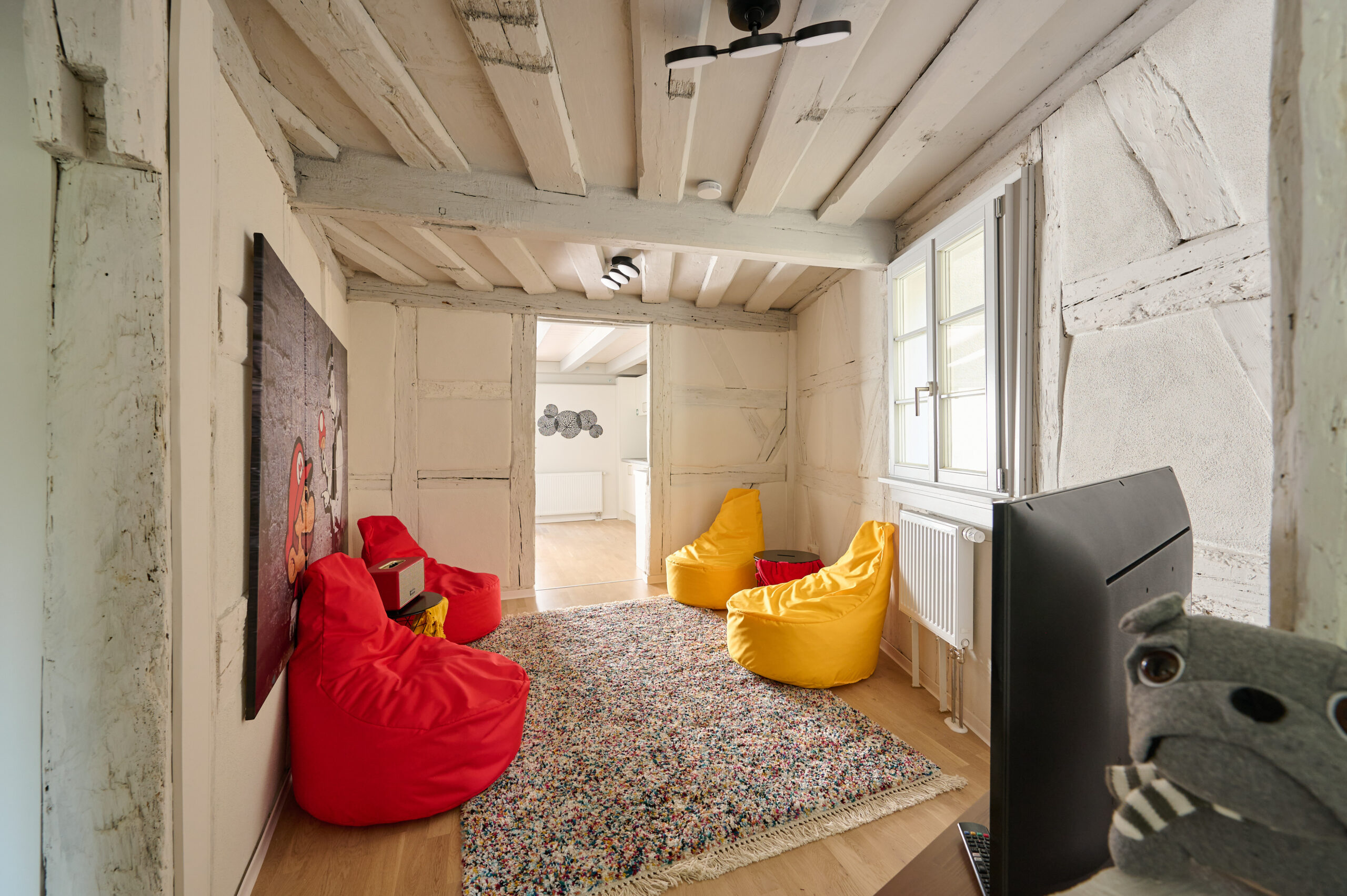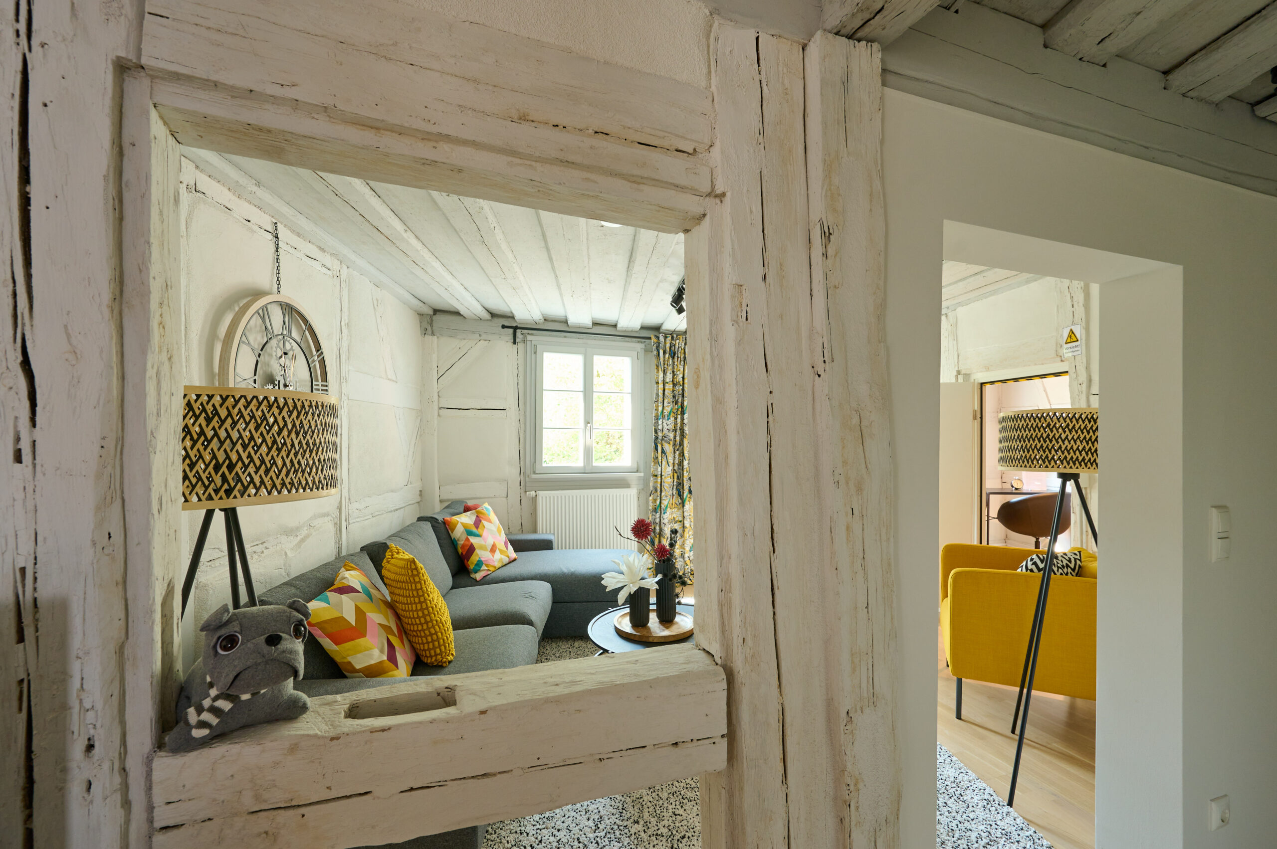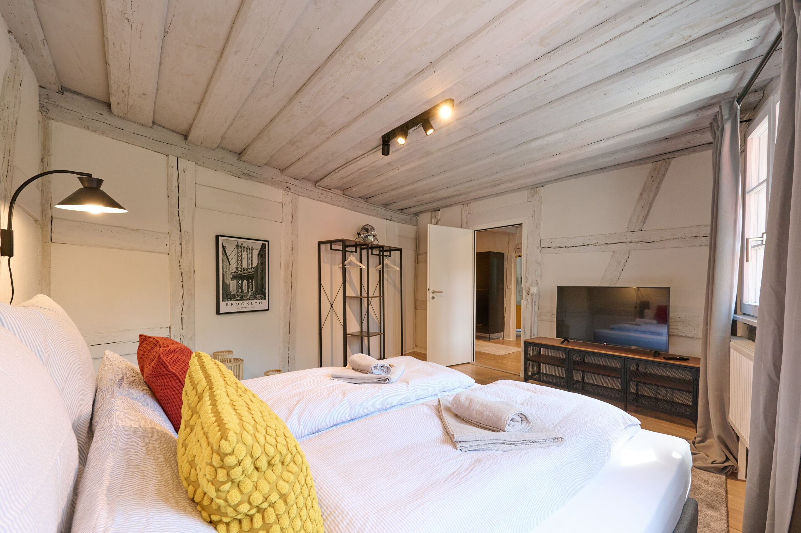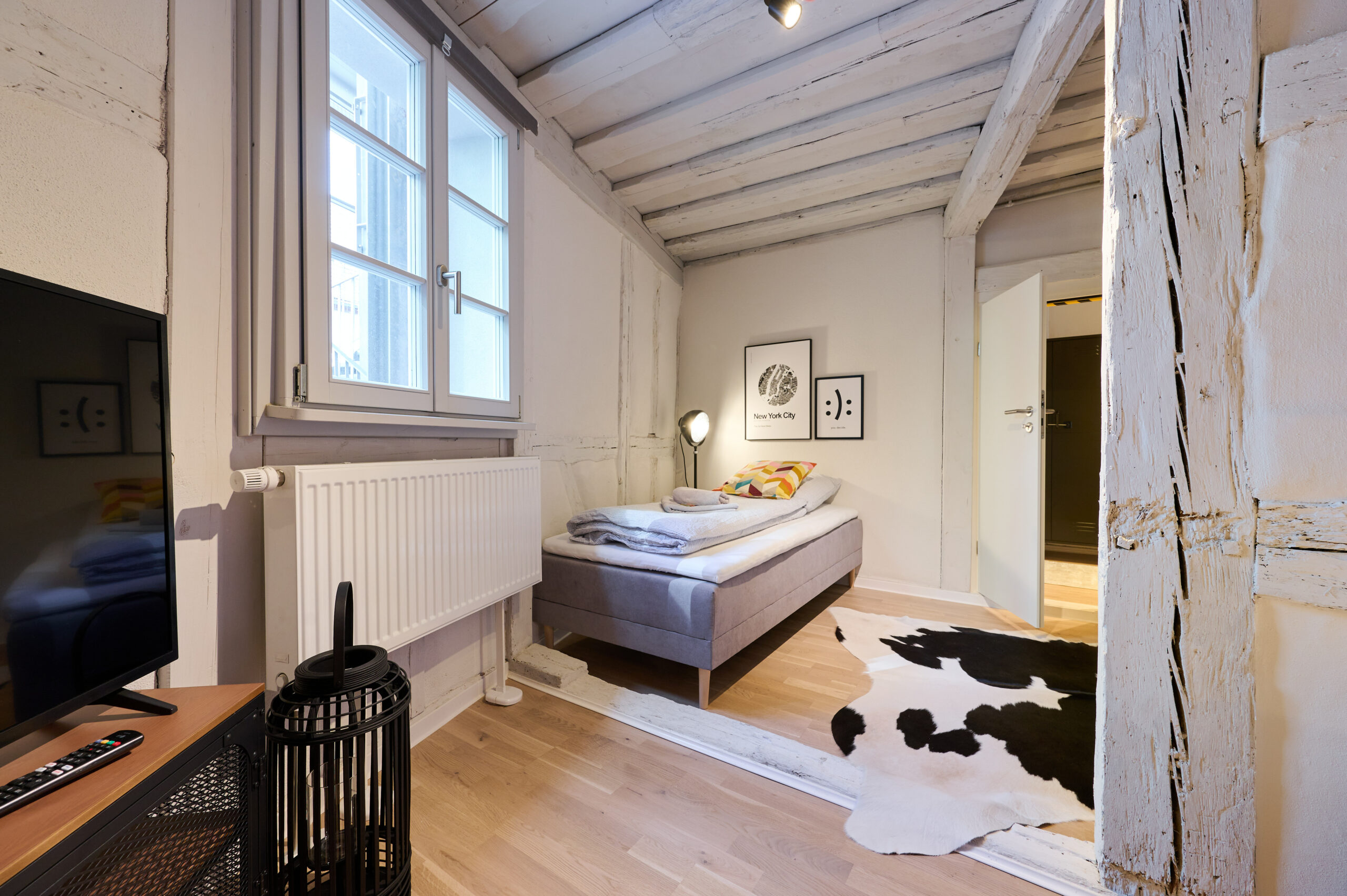 Ein langjähriger Kunde von Astrid Fuchs beauftragte sie, für ihn ein neu angemietetes gewerbliches Air Bnb Apartment einzurichten. Die Wohnung mit Fachwerkwänden und außergewöhnlichem Grundriss stellte gewissen Anforderungen an die Interior Designerin. Gewünscht war hier ein Einrichtungskonzept, das viele Menschen anspricht, mit günstigem Mobiliar ausgestattet ohne jedoch billig zu wirken.
