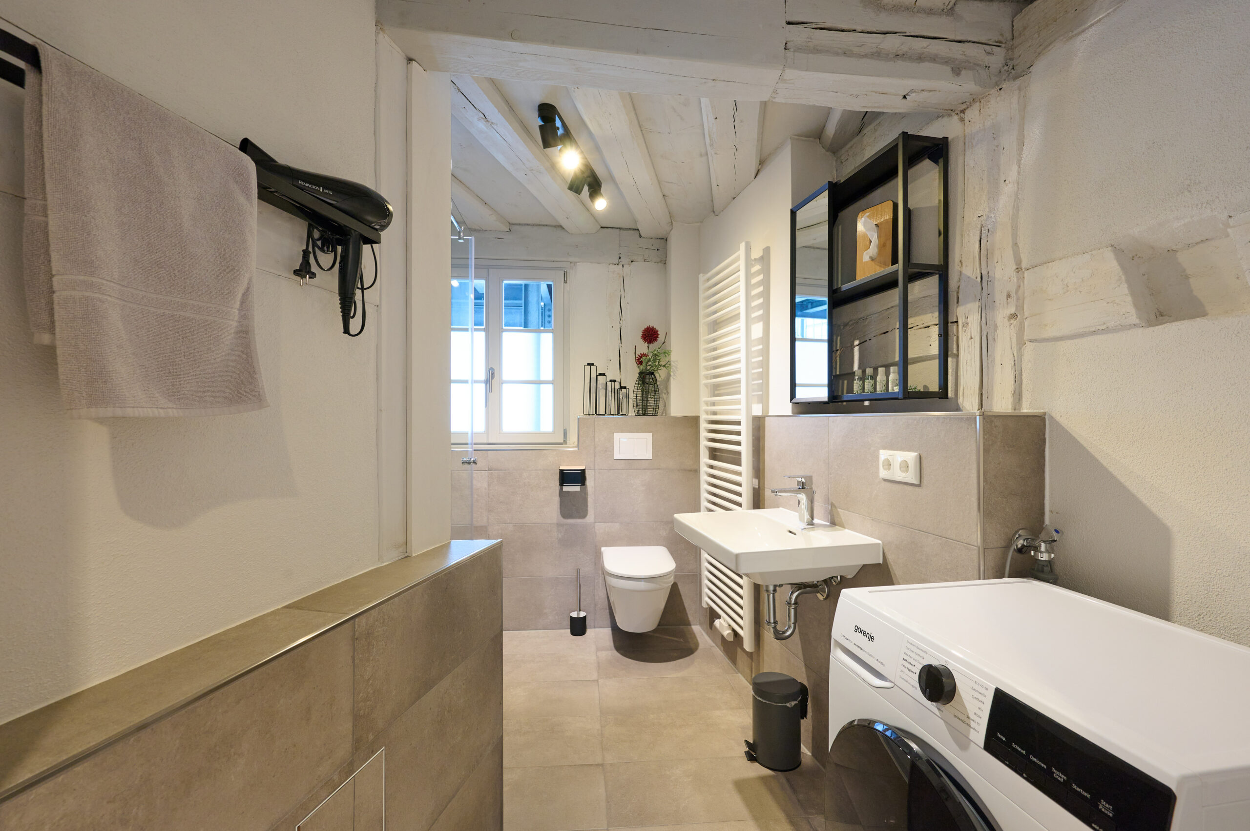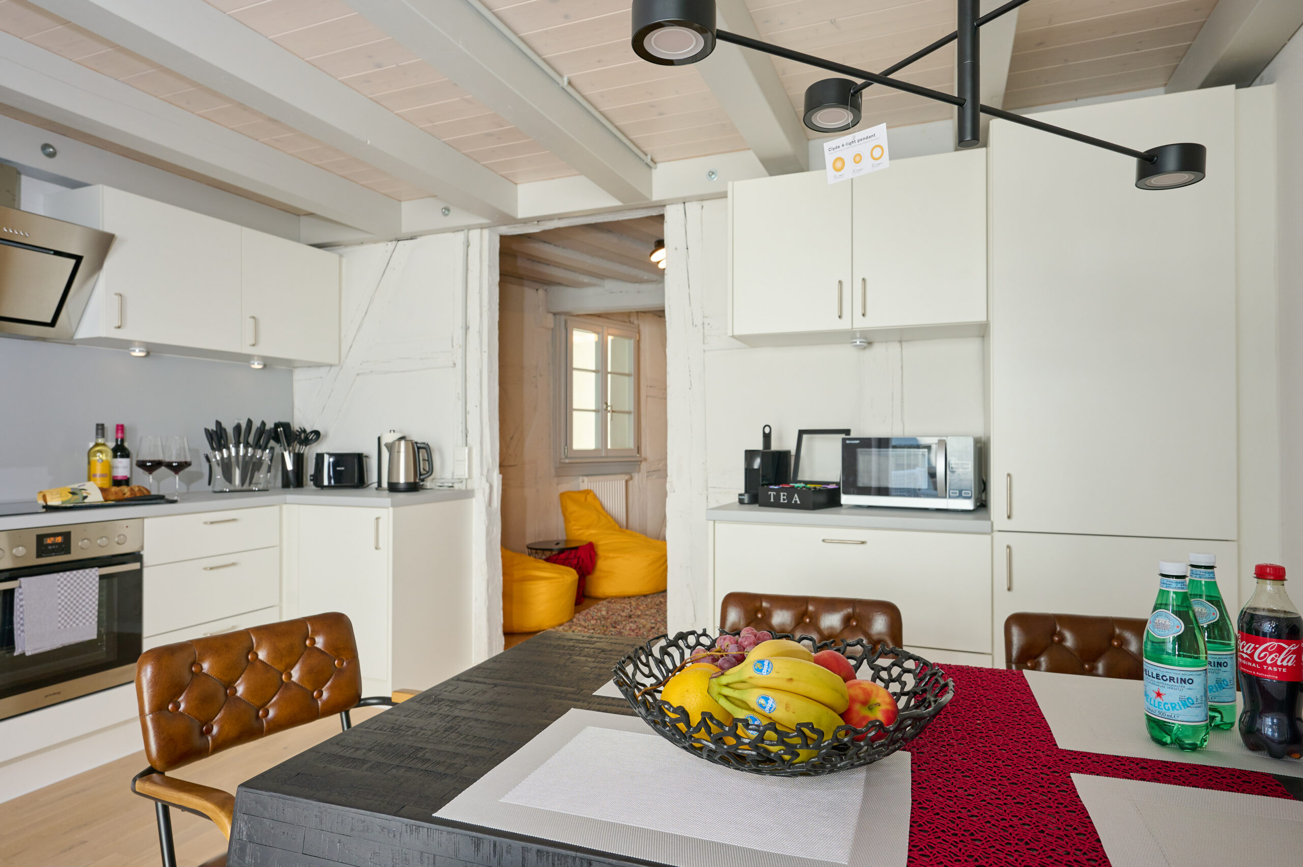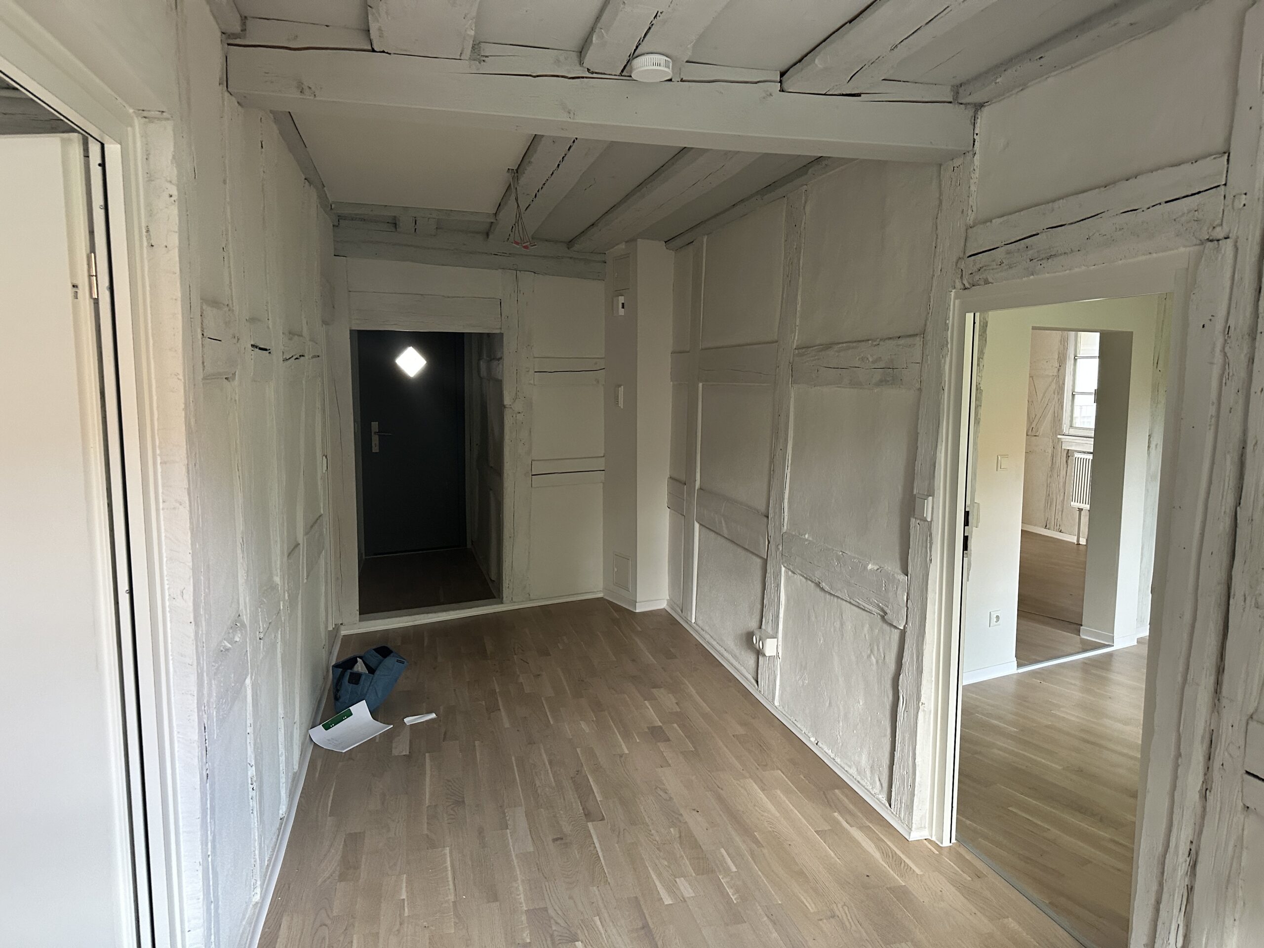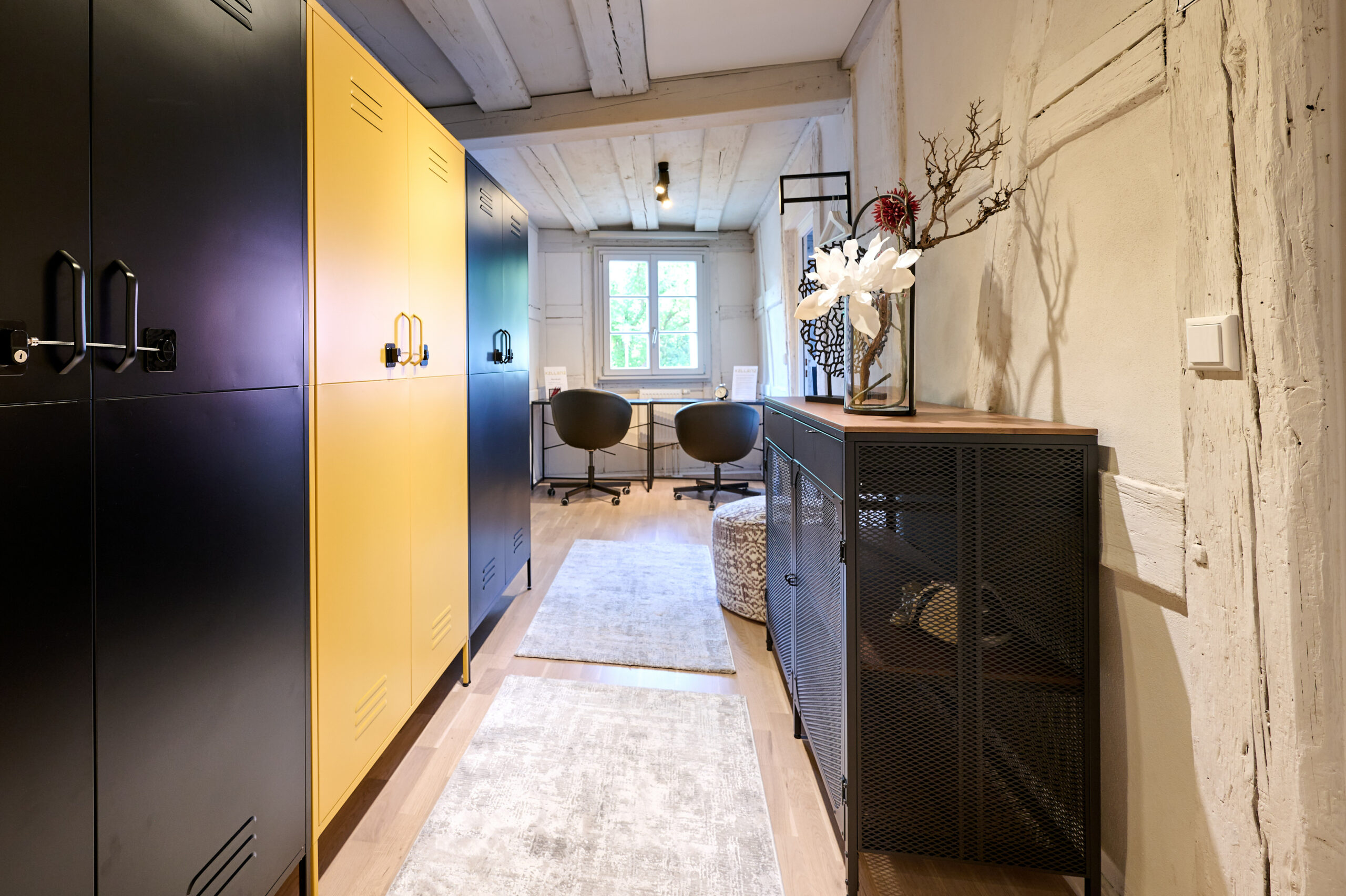 Ein langjähriger Kunde von Astrid Fuchs beauftragte sie, für ihn ein neu angemietetes gewerbliches Air Bnb Apartment einzurichten. Die Wohnung mit Fachwerkwänden und außergewöhnlichem Grundriss stellte gewissen Anforderungen an die Interior Designerin. Gewünscht war hier ein Einrichtungskonzept, das viele Menschen anspricht, mit günstigem Mobiliar ausgestattet ohne jedoch billig zu wirken.