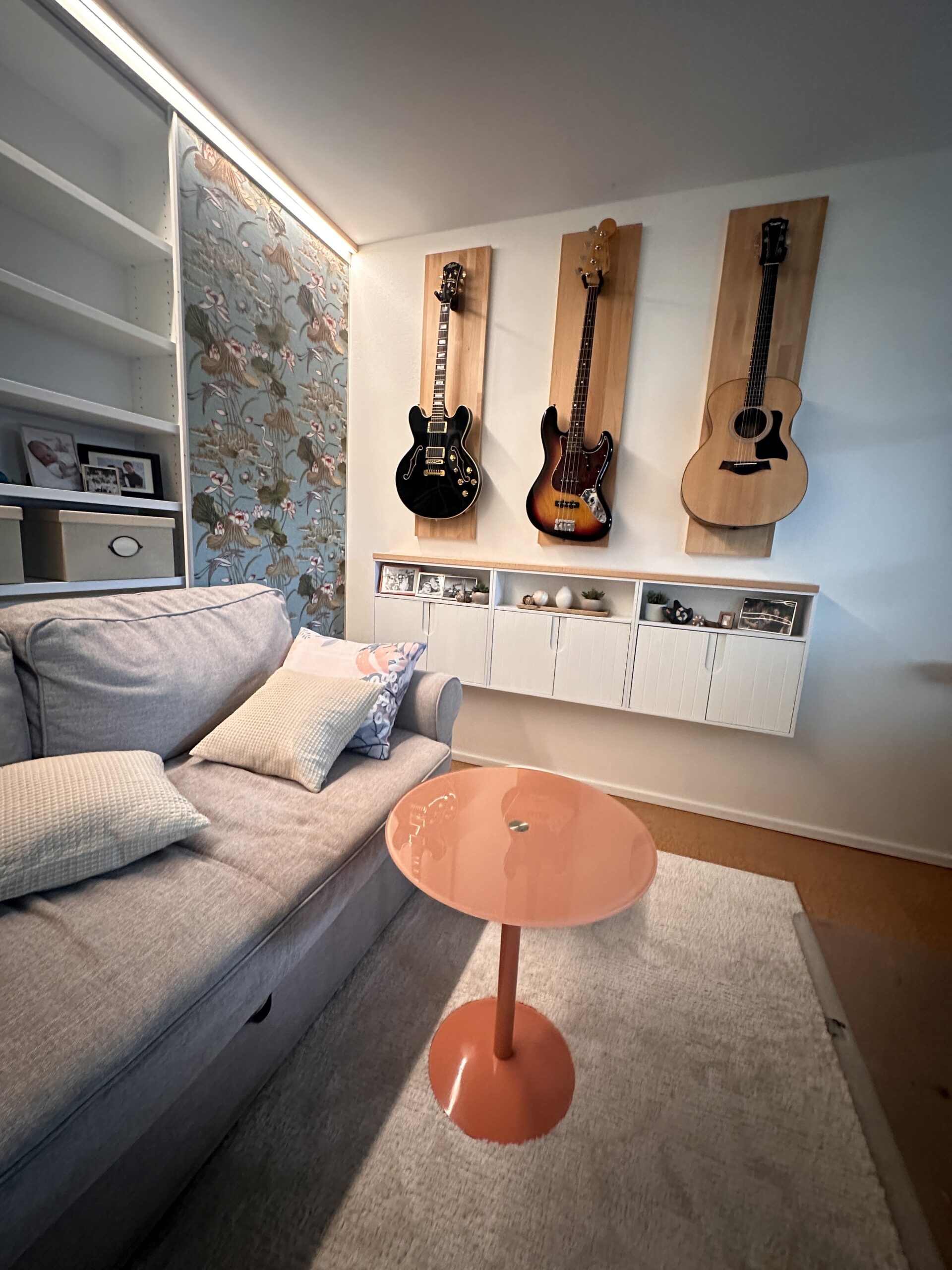 In diese zwei Reihen Regale hintereinander kann ganz viel verstaut werden. Zusätzlich stehen neben dem Sofa schlanke Wandschränkchen zur Verfügung. Die Gitarren hängen dekorativ an Holz-Wandpaneelen.