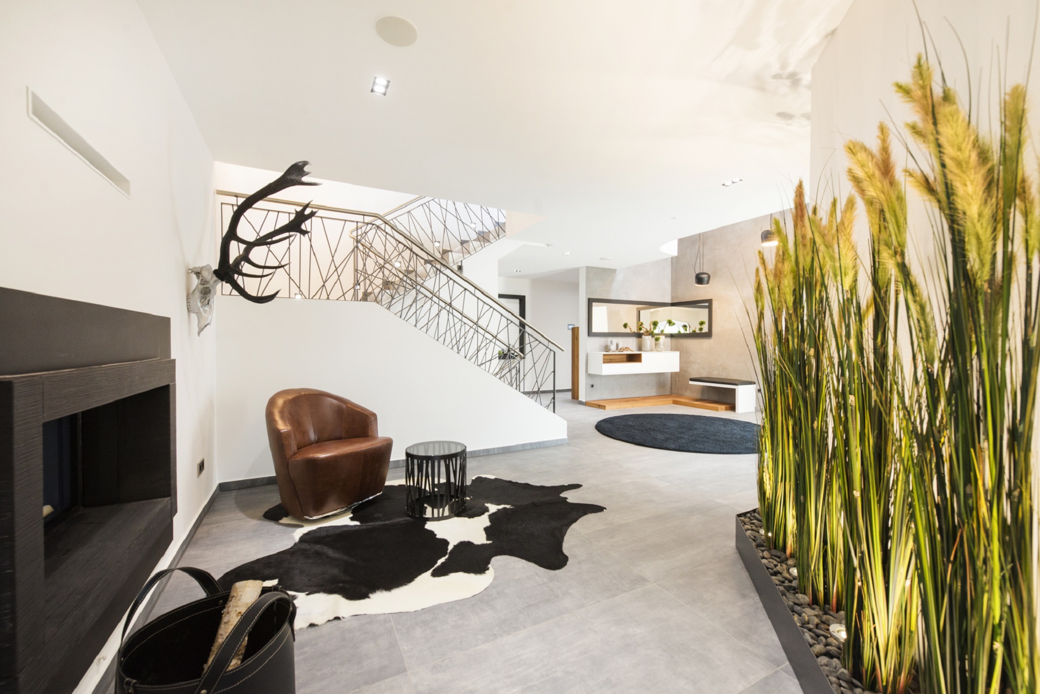 Den Kunden war wichtig, dass das Haus trotz seiner Größe gemütlich wird. Besonderes Augenmerk sollte auf eine einladende Eingangshalle gelegt werden. Hier wollte die Hausherrin auf keinen Fall eine klassische Garderoben-Lösung.