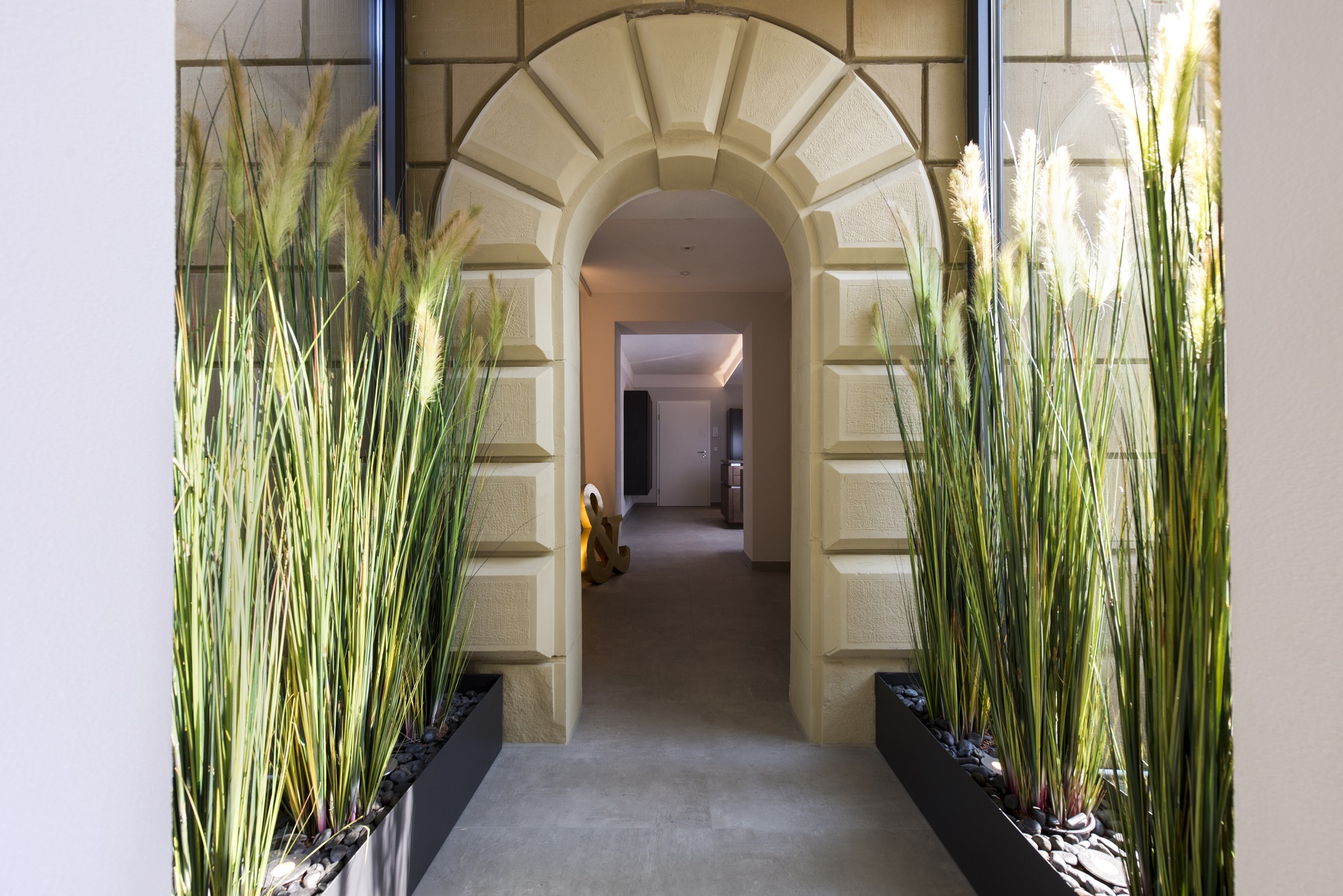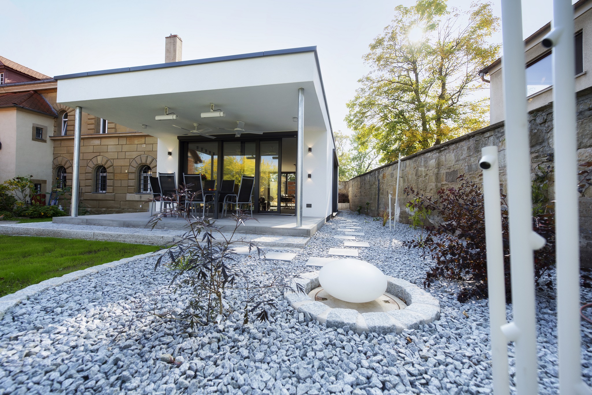 Astrid Fuchs erstellt für ein Haus aus dem Jahr 1840, das u.a. sogar schon als Gefängnis diente, eine Grundrissplanung. Eine Hälfte des Erdgeschosses wurde komplett neu geplant und mit einem Handwerkerteam des Kunden umgesetzt. Es stand neben dem Altbau eine Garten-Freifläche zur Verfügung. tRÄUME plante einen kubischen Anbau im Bauhaus-Stil, der sich der Denkmalschutzfassade quasi unterordnet. Die Anbindung ans Haupthaus wurde mit einem schmalen Glasdurchgang geschaffen, der dezent mit XL-Gräsern und Lichtspots in Szene gesetzt wird.