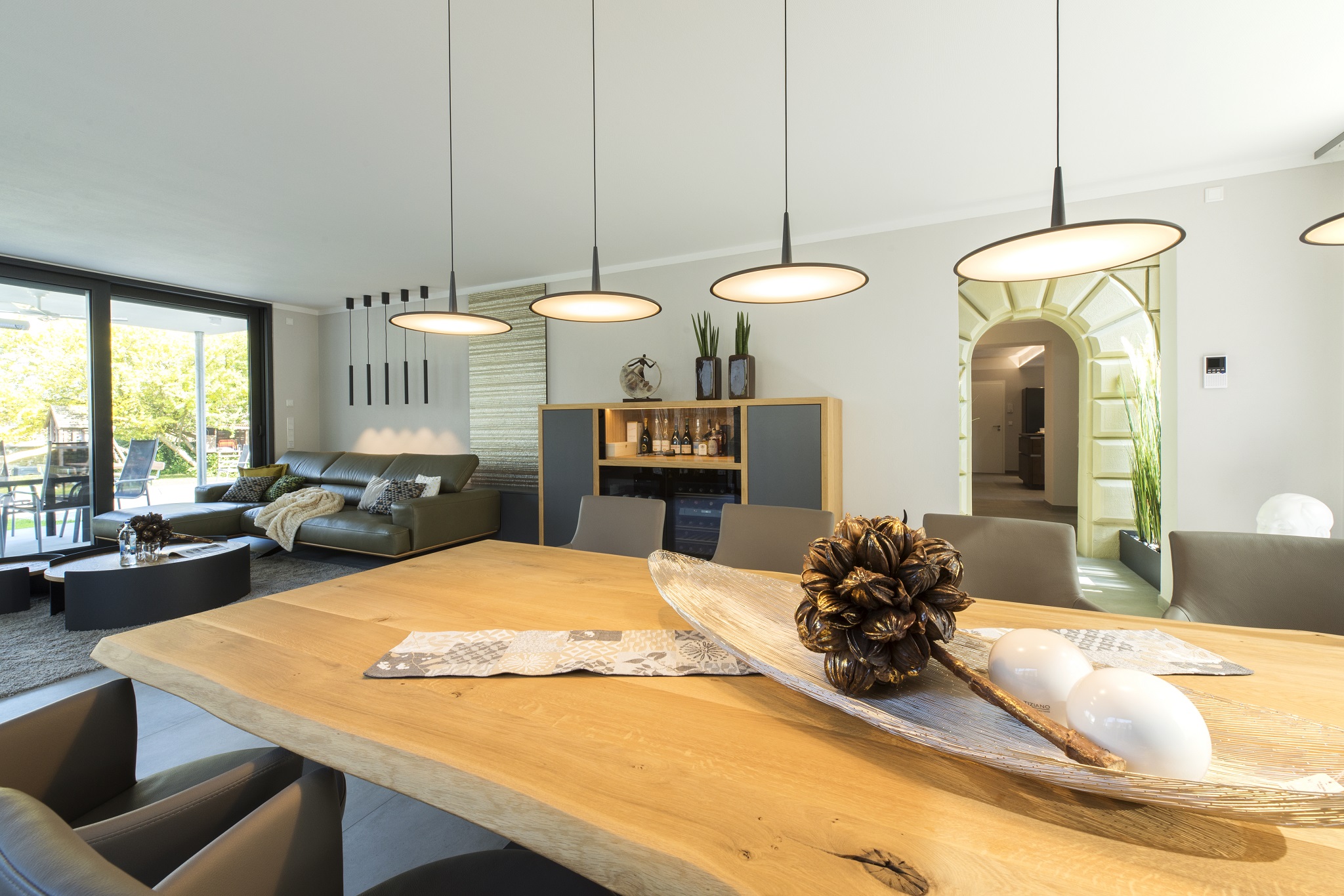 Besonderer Clou ist hier die Anbindung des schlichten Anbaus im Bauhaus-Stil an die Denkmalschutz-Fassade. Ein schlanker mit Glas verkleideter Übergang oder auch “Schleuse” verbindet die beiden Gebäudeteile. Dieses Bauteil leitet dezent über ein einen weit sich öffnenden Wohn- und Essbereich. Ein tolles Beispiel durchdachter Innenarchitektur und Lichtplanung.