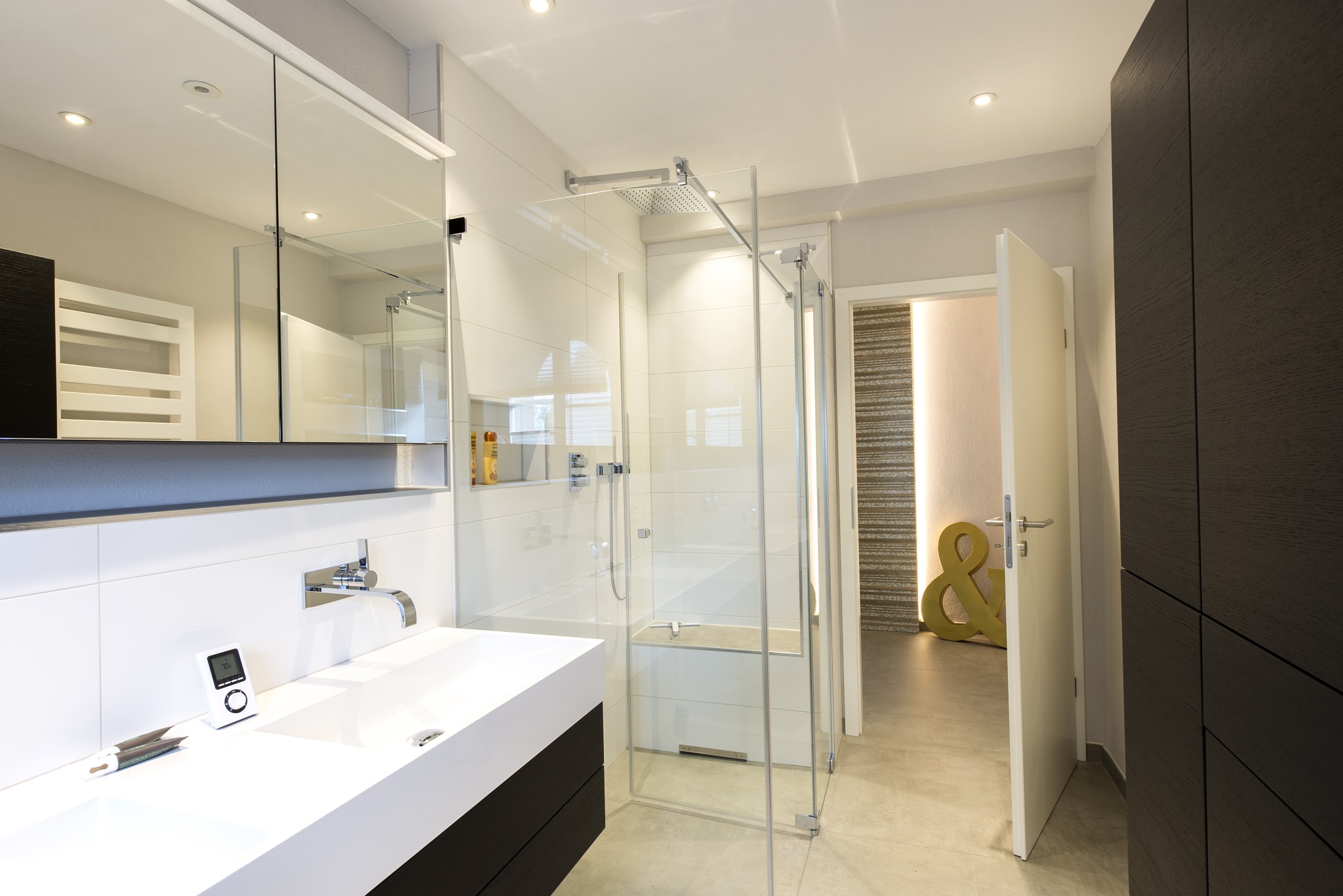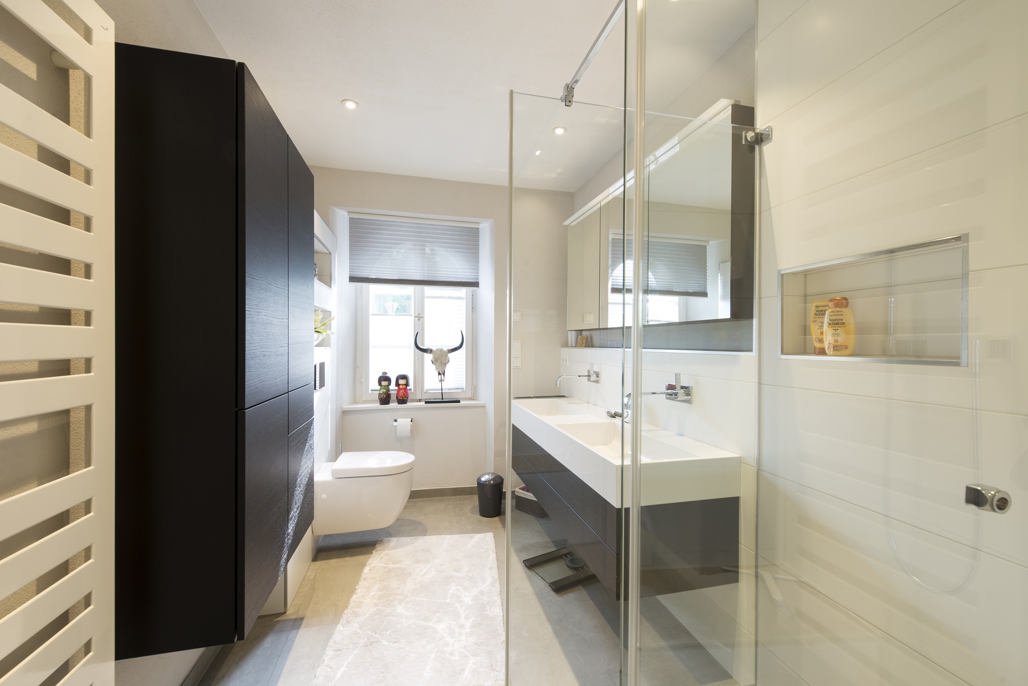 Das Bad kam im ehemaligen Flurbereich unter. Ein Durchgang wurde verlegt, um den Grundriss optimal gestalten zu können. Die Farbgebung Schwarz, Braun in Kombination mit weiß und Naturtönen spiegelt sich in der gesamten Wohnung wieder.