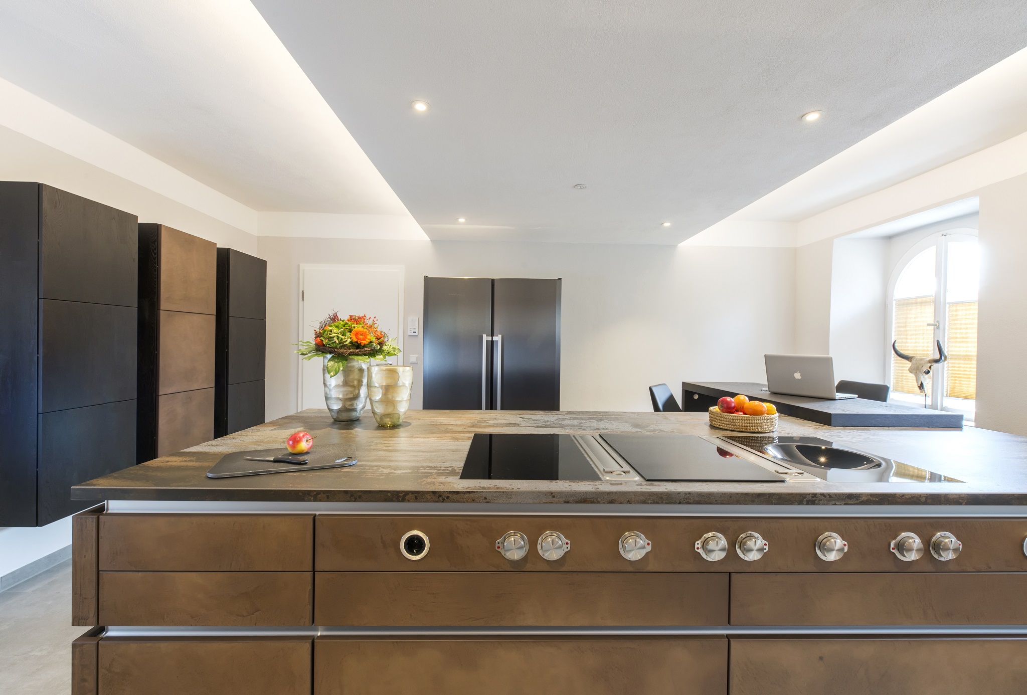 Die Küche hat einen nüchtern maskulinen Look. Hier kocht der Hausherr. Einen tollen Effekt bringen die Vibia-Anbauleuchten über der Arbeitsfläche.