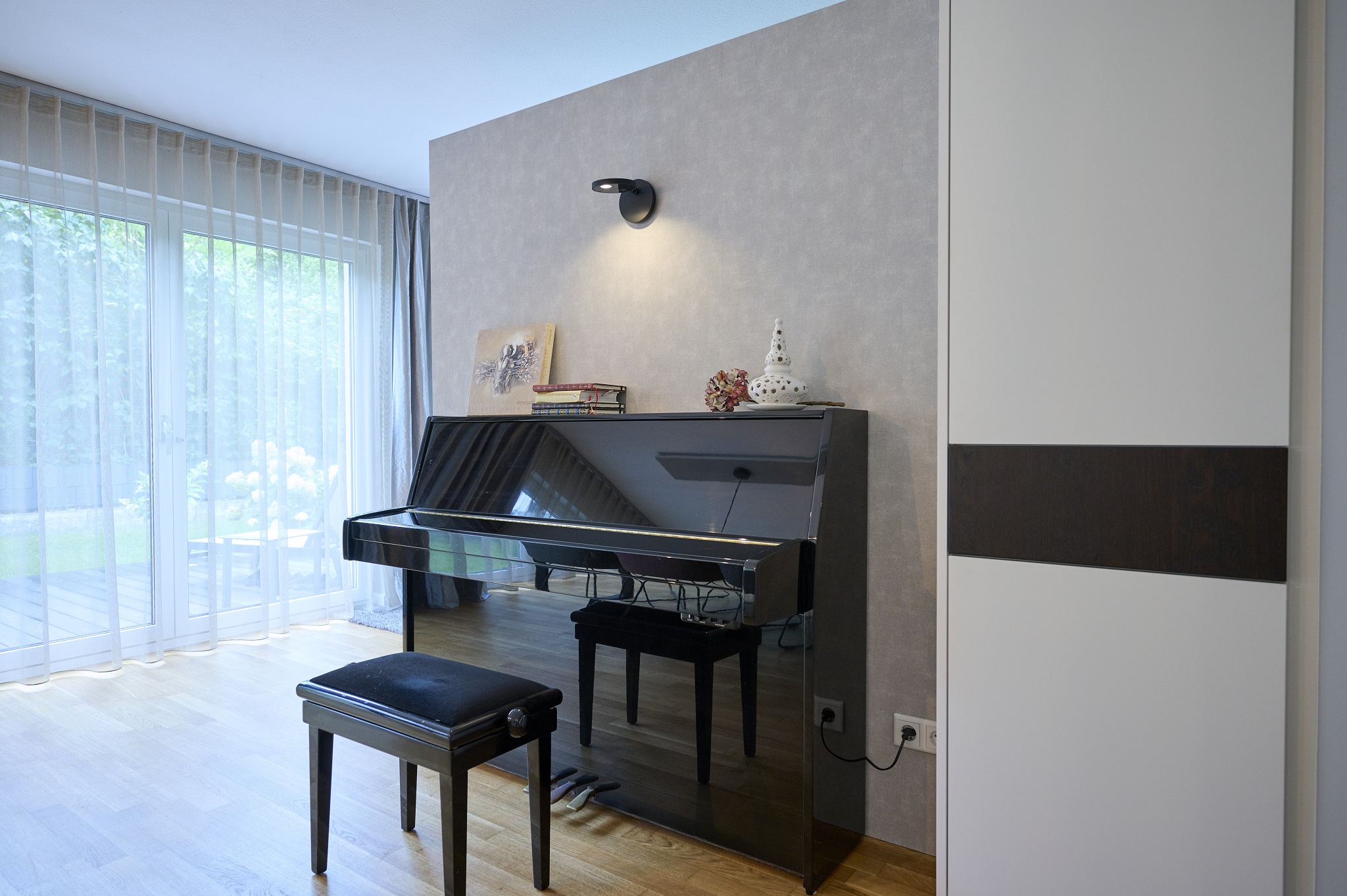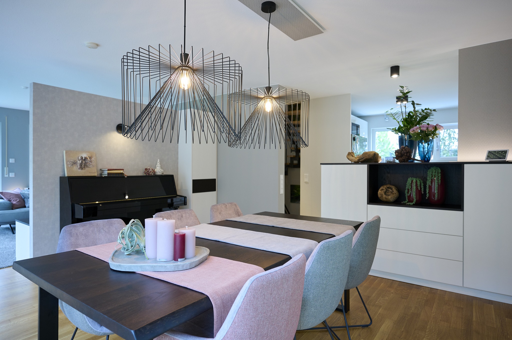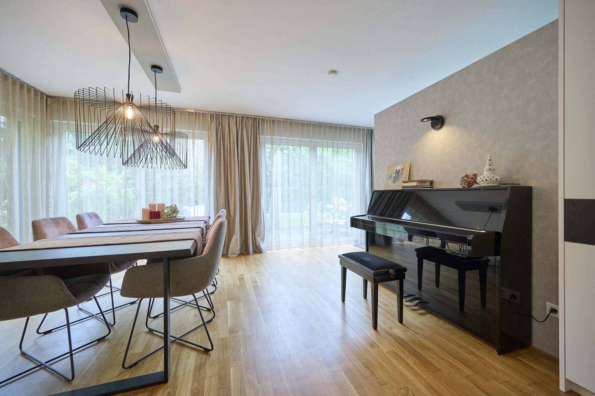 Die Gestaltung dieses Raumes bereitete der Familie seit der Bauphase schon Kopfzerbrechen. Der Grundriss war einfach nicht optimal, um die Bereiche Wohnen & Essen unterzubringen. Außerdem sollte ein Klavier “schön” integriert werden und das TV-Gerät optimalerweise so angebracht werden, dass man bequem den Blick darauf richten kann, ohne sich entweder den Kopf zu verrenken oder aber zu viel Entfernung zu haben.