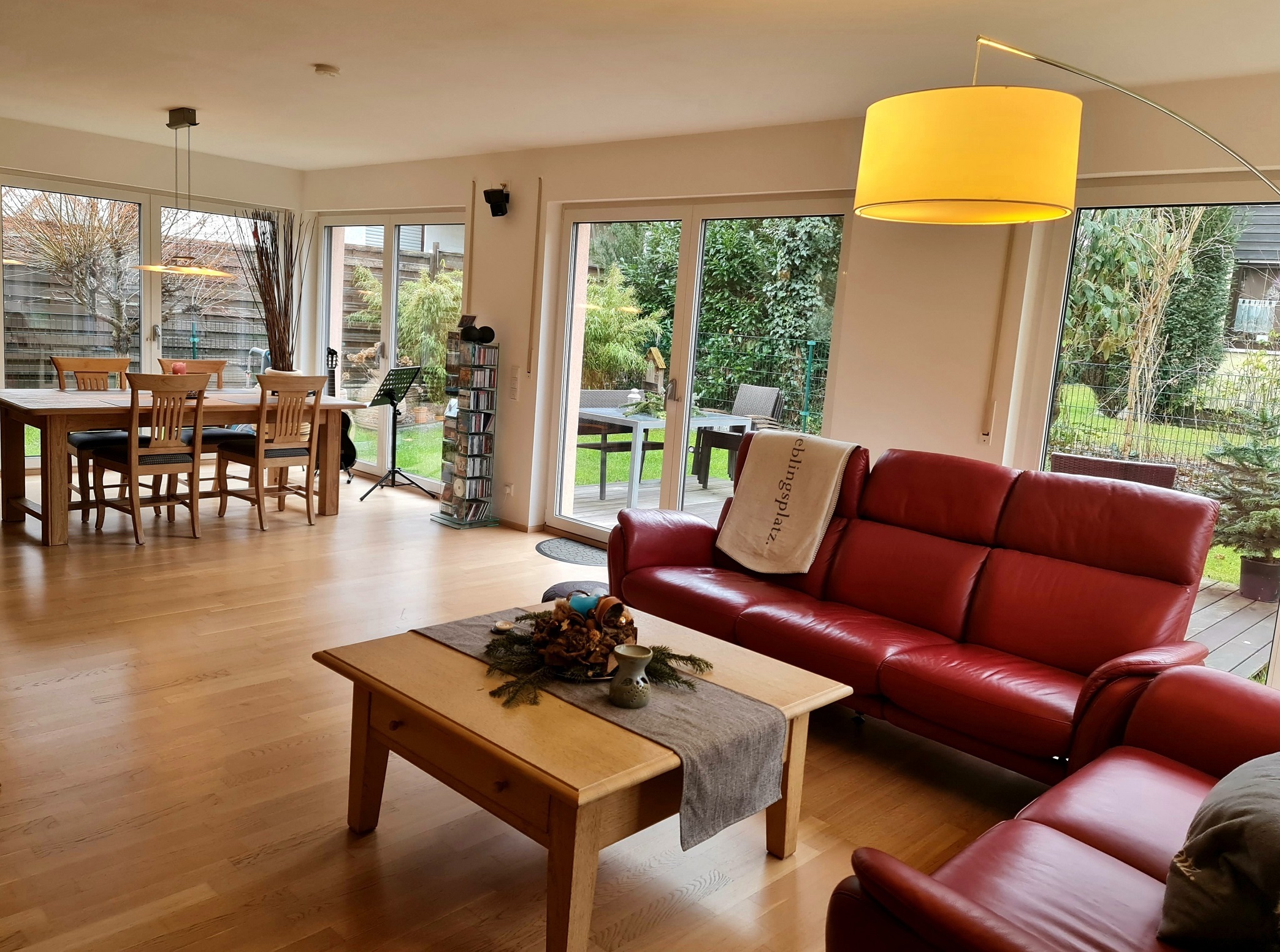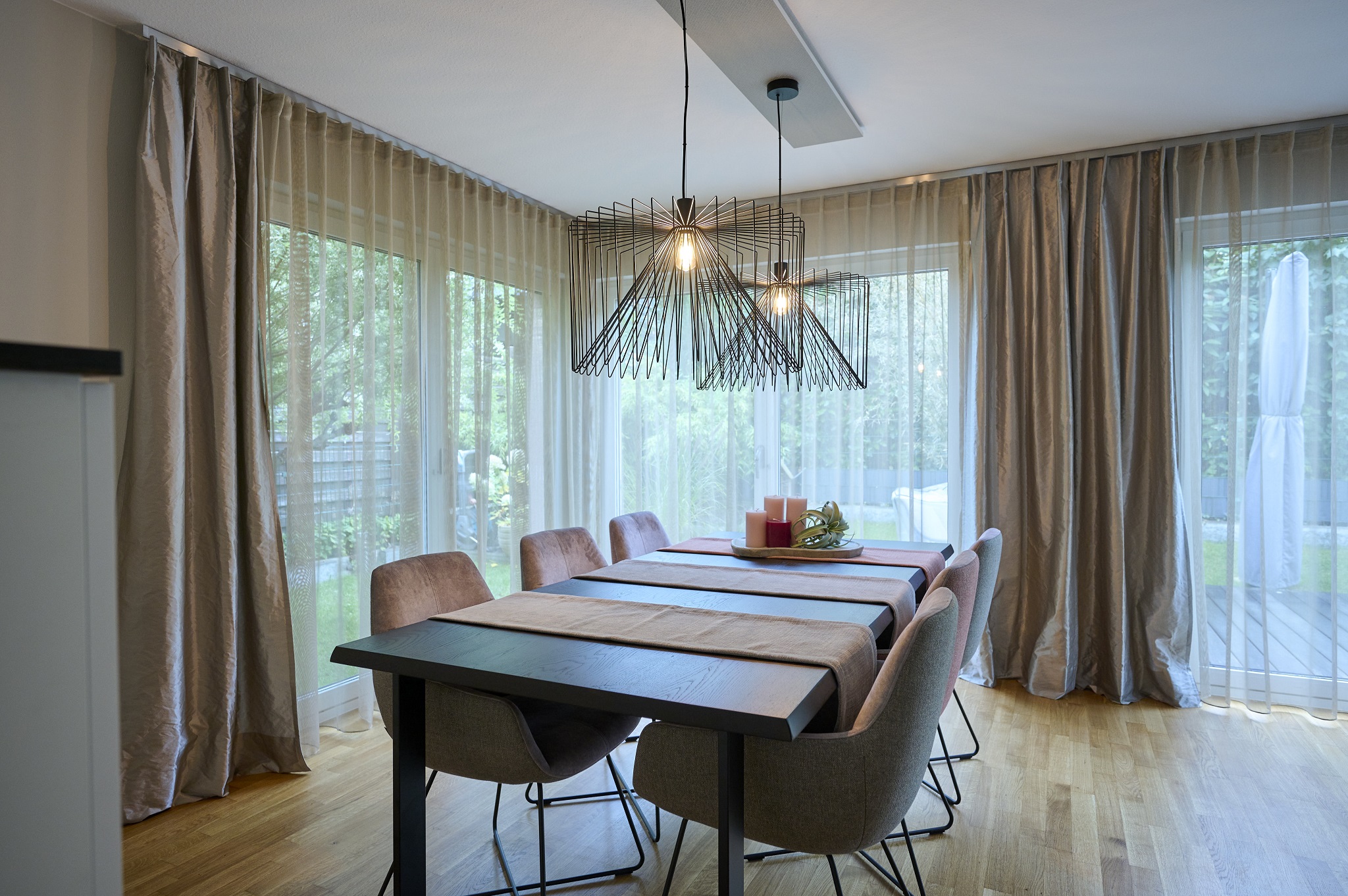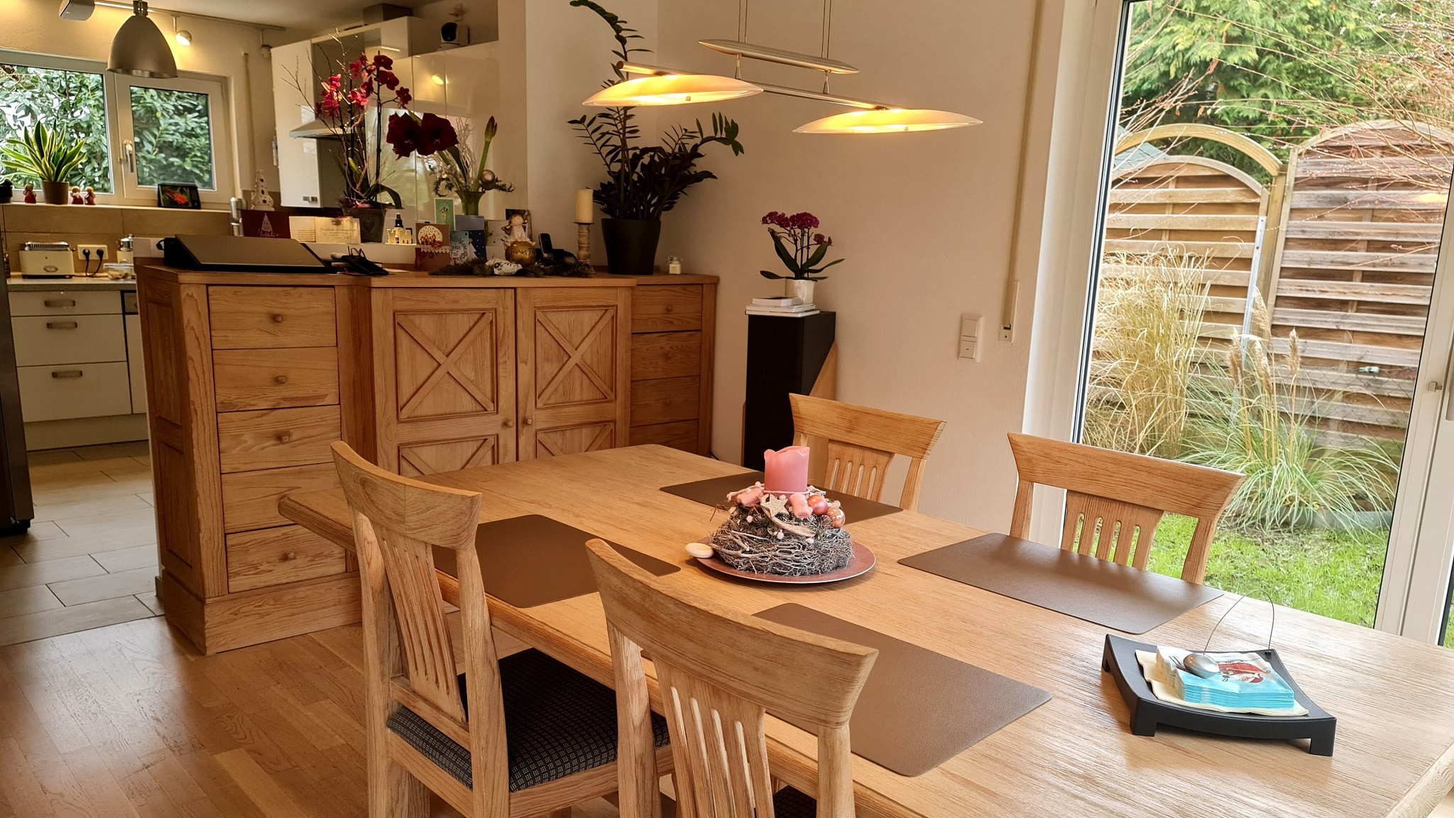 Die Gestaltung dieses Raumes bereitete der Familie seit der Bauphase schon Kopfzerbrechen. Der Grundriss war einfach nicht optimal, um die Bereiche Wohnen & Essen unterzubringen. Außerdem sollte ein Klavier “schön” integriert werden und das TV-Gerät optimalerweise so angebracht werden, dass man bequem den Blick darauf richten kann, ohne sich entweder den Kopf zu verrenken oder aber zu viel Entfernung zu haben.