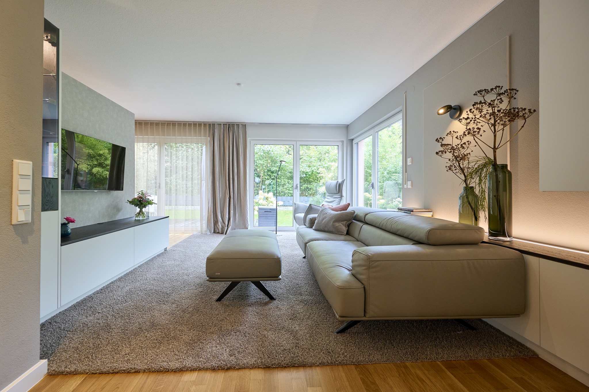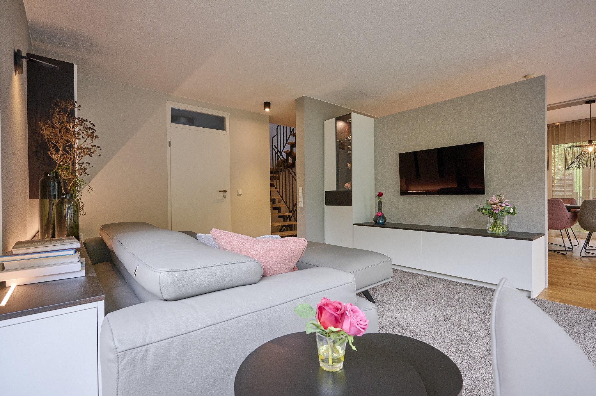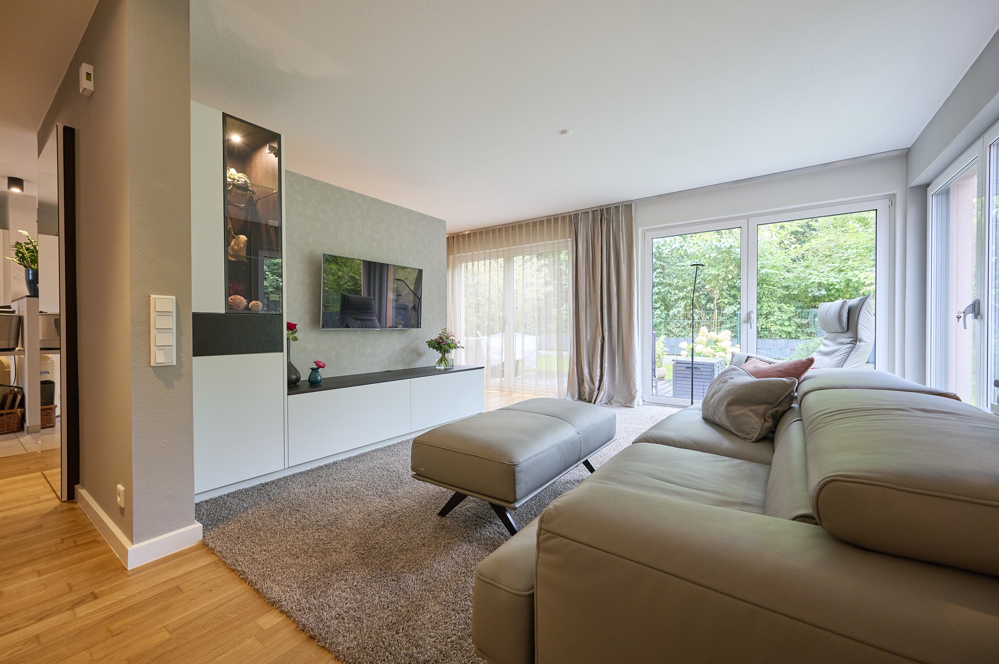 Schon von vornherein war klar: hier konnte Raumgewinn nur durch den Einsatz eines Raumteilers erreicht werden. Vor allem die Position des TV-Geräts im Sinne schöner Raumästhetik und Ergonomie war nur so lösbar.