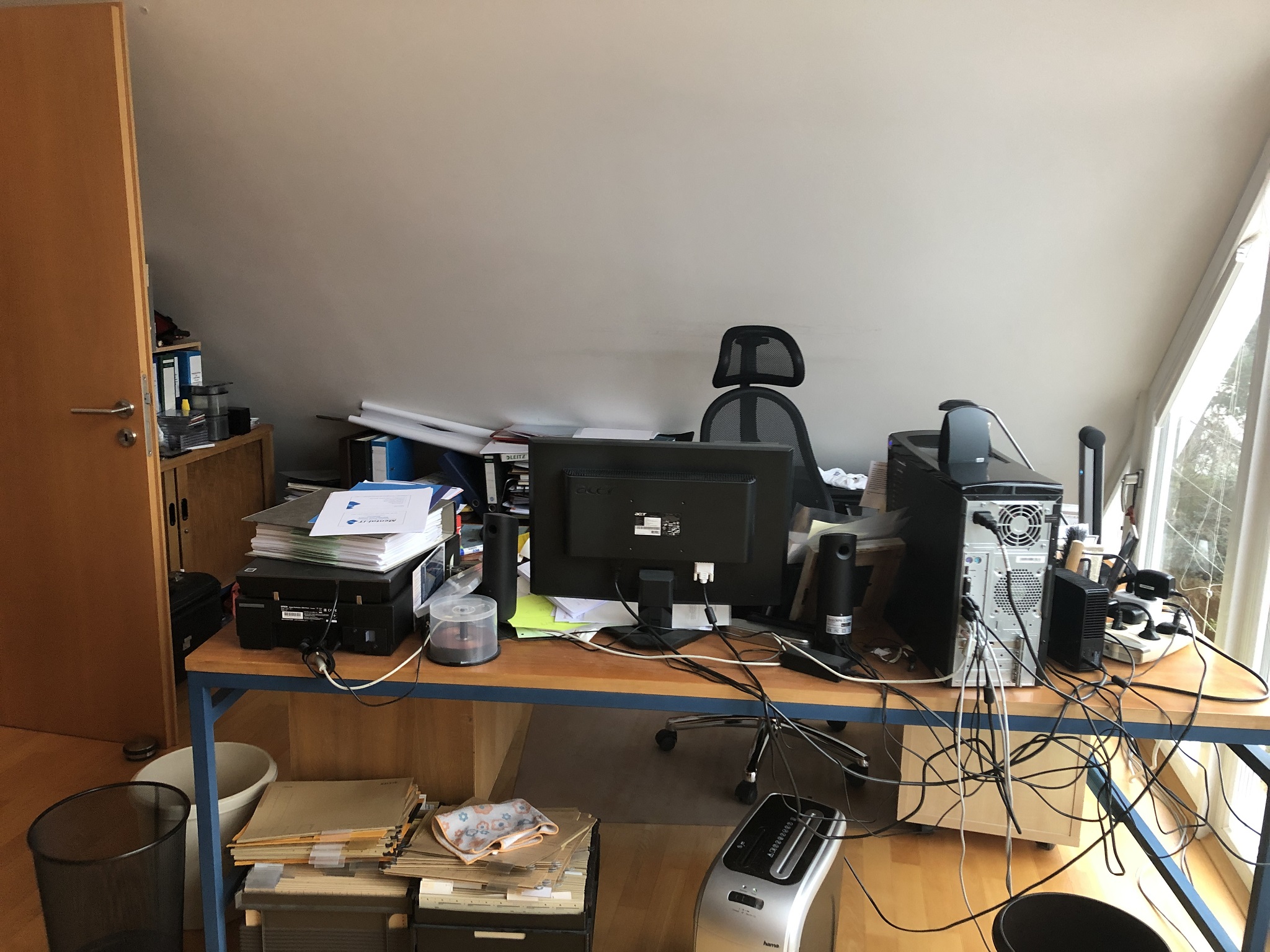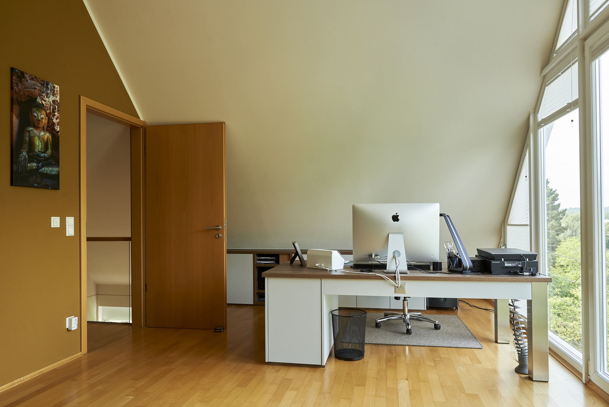 Wir planten in unserem Haus einige Renovierungsarbeiten vorzunehmen. Vorwiegend Wände streichen im Hausaufgang und Flure. Darüber hinaus wollten wir unser großes Dachstudio/Arbeitszimmer ein wenig umzugestalten. Es bestand mehr oder weniger aus einem Sammelsurium von Möbeln, in denen man Aktenordner und Bücher unterbringen kann. Da das Studio einen wunderbaren Blick in die Ferne und ins Grüne hat, wollten wir es uns gemütlicher und ordentlicher gestalten. Um die Sache richtig anzugehen suchten wir uns Rat.