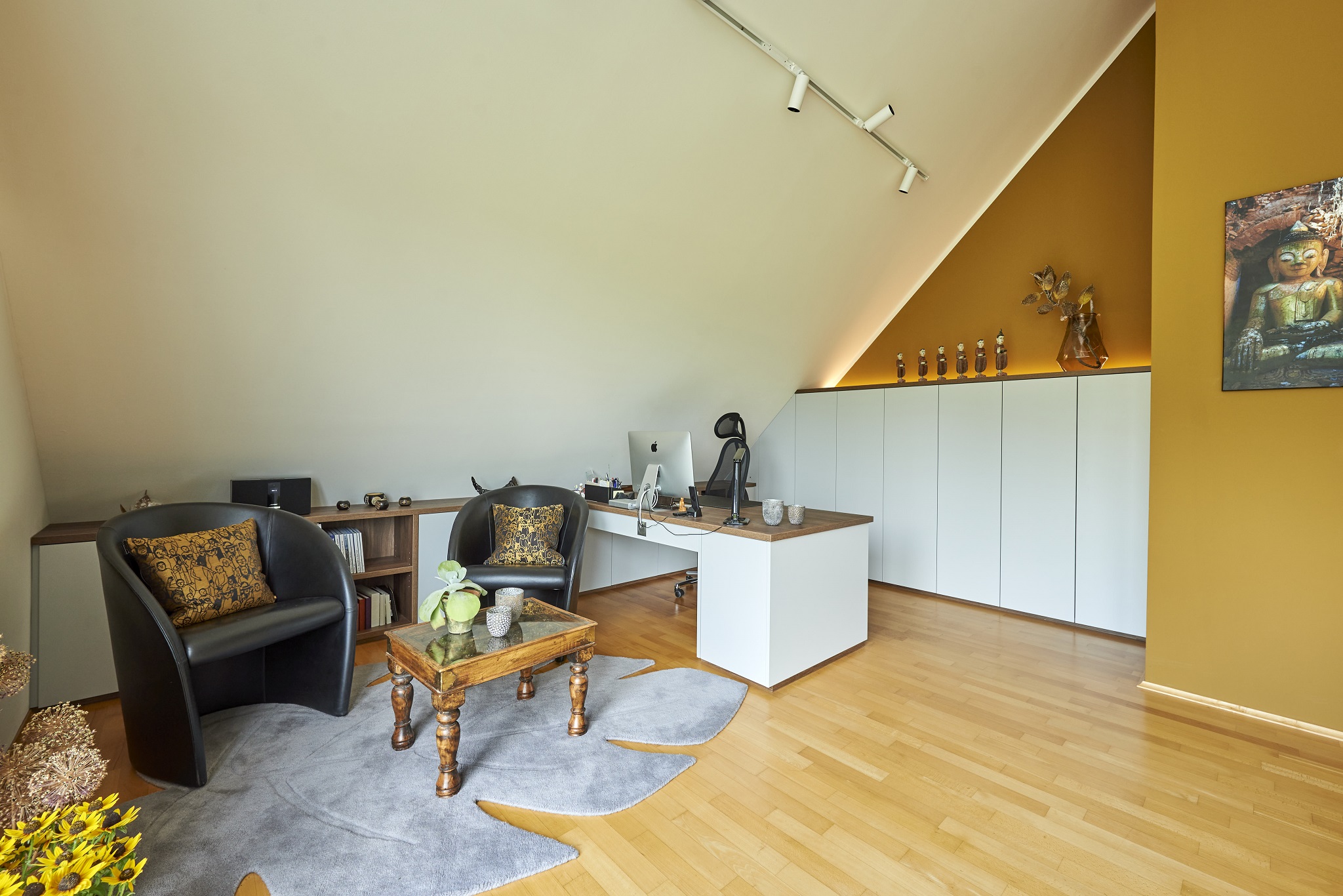 Die Nutzung sollte bestehen bleiben – zwei Arbeitsplätze. Jedoch sollte mehr Ruhe, Ordnung und Wohlfühl-Feeling geschaffen werden.