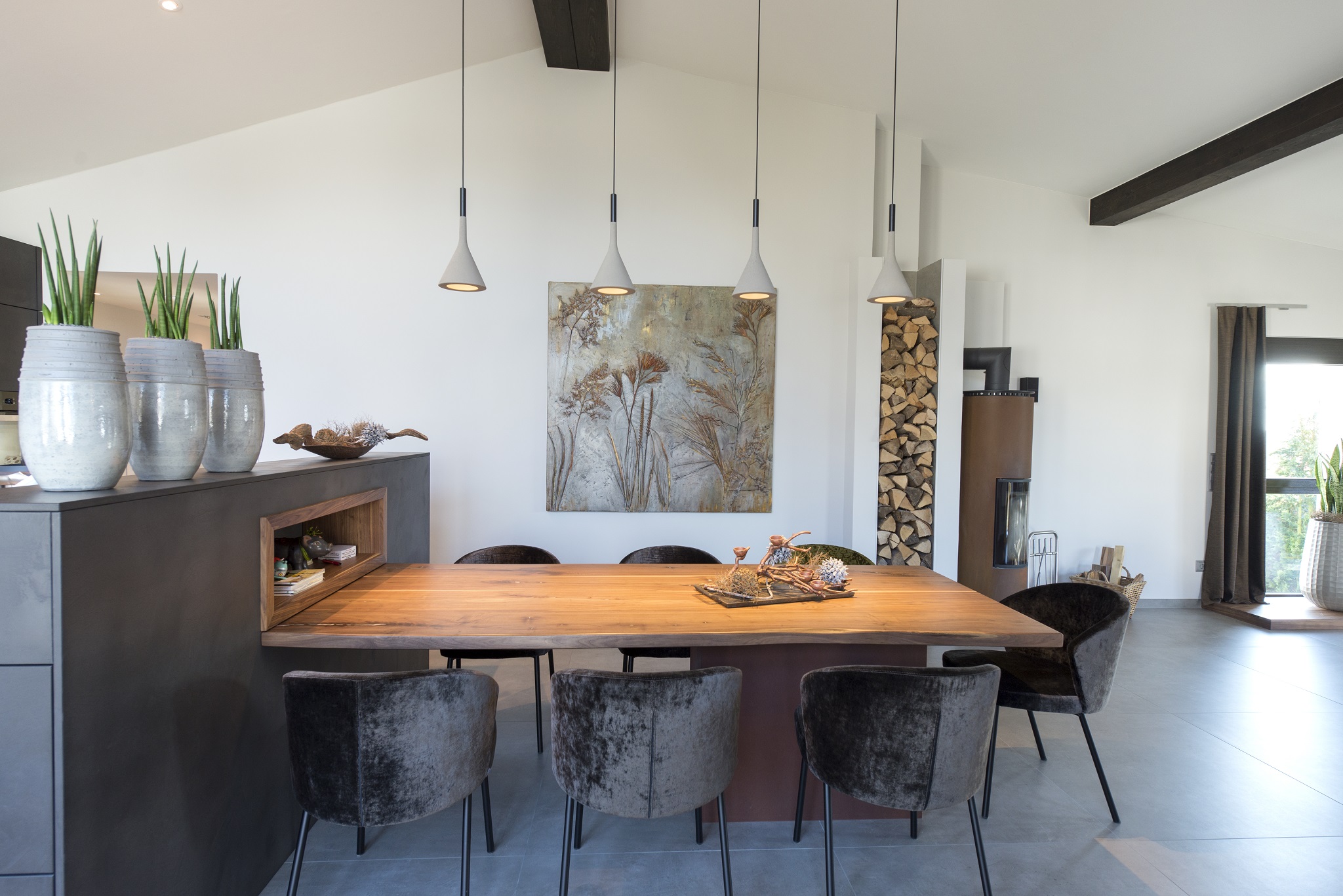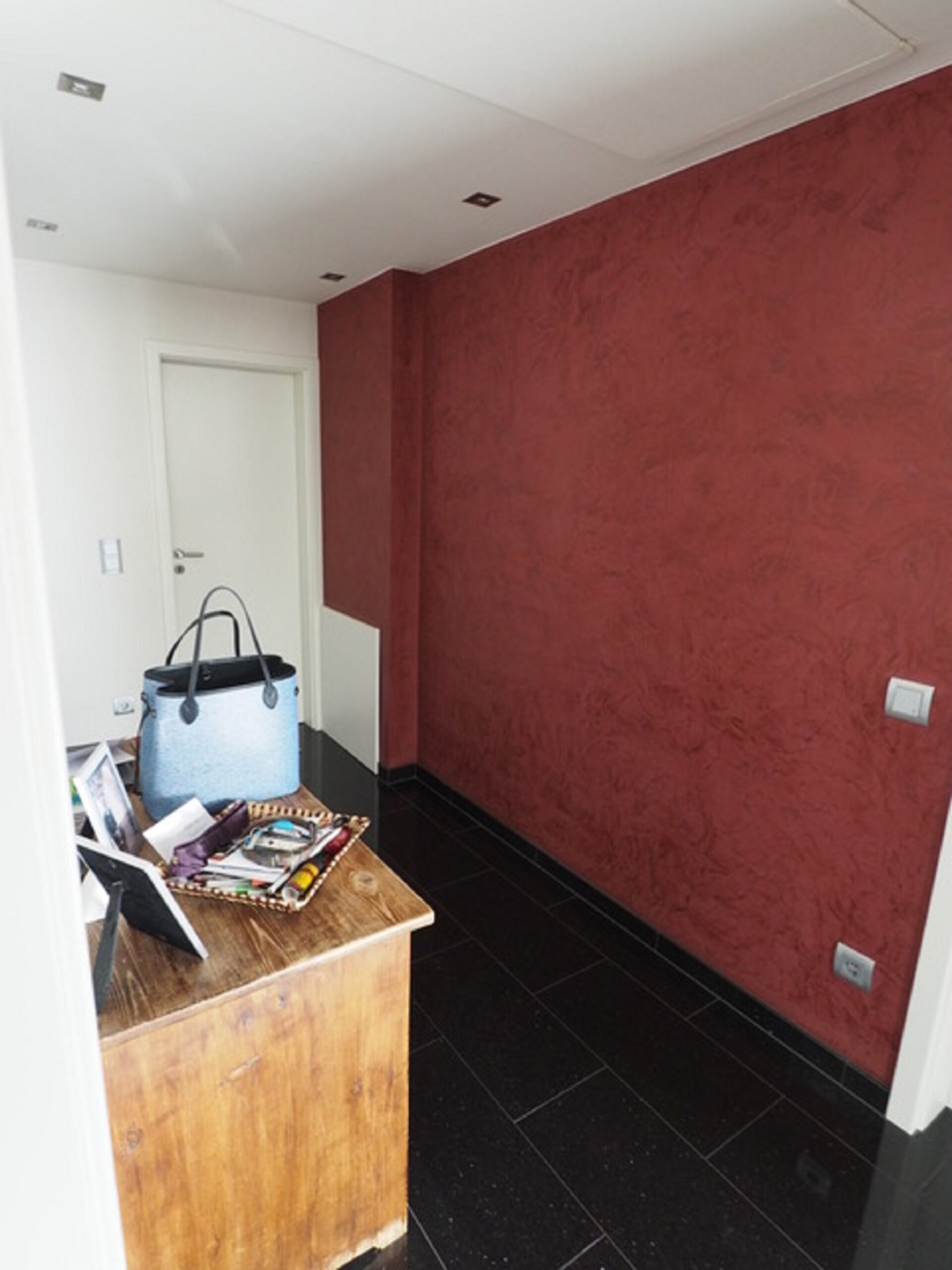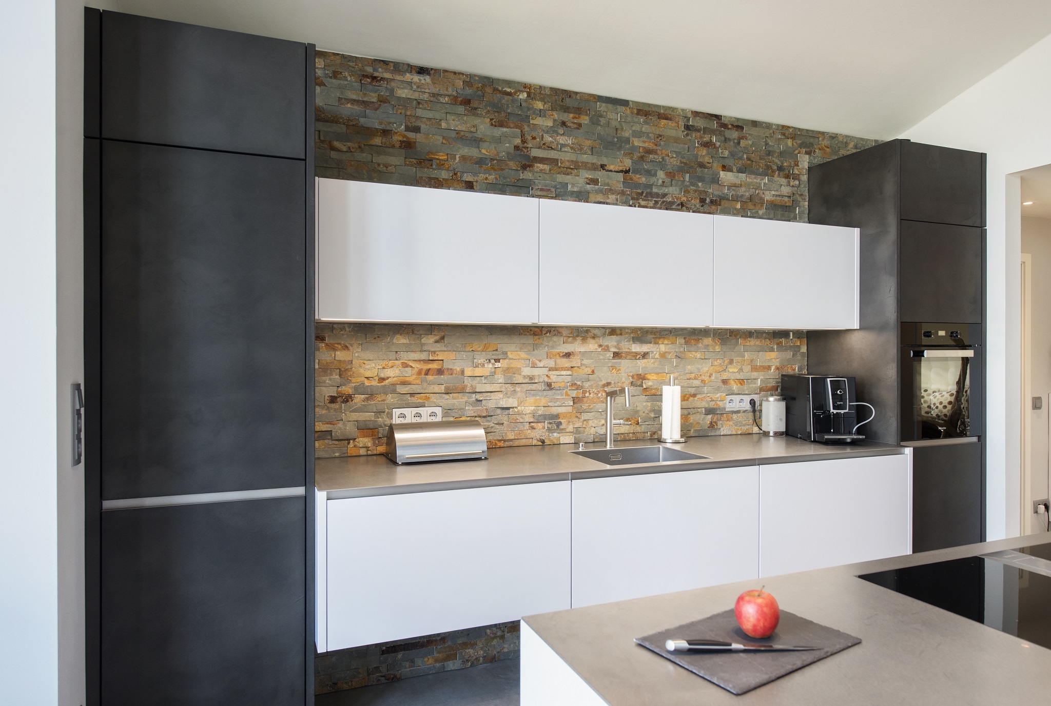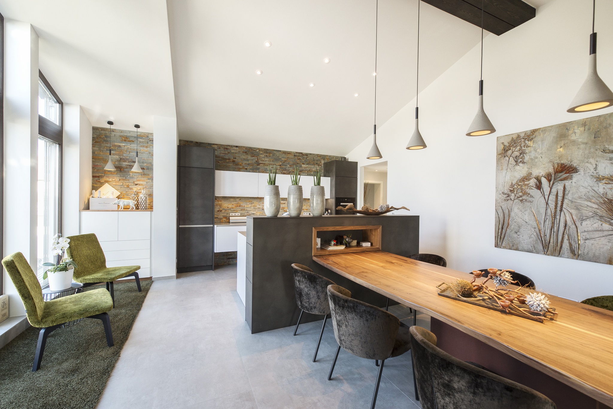 Vor allem der Flur ist nun viel ansprechender. Die Küche ist kaum wiederzuerkennen. Man meint, man sei in einem komplett anderen Raum. Die Kunden sind von der Material-Zusammenstellung begeistert. I-Tüpfelchen ist ein Auftragsbild, welches durch die Künstlerin Karo Qader-Lilla mit Design-Vorgaben von Frau Fuchs im Großformat anfertigte.