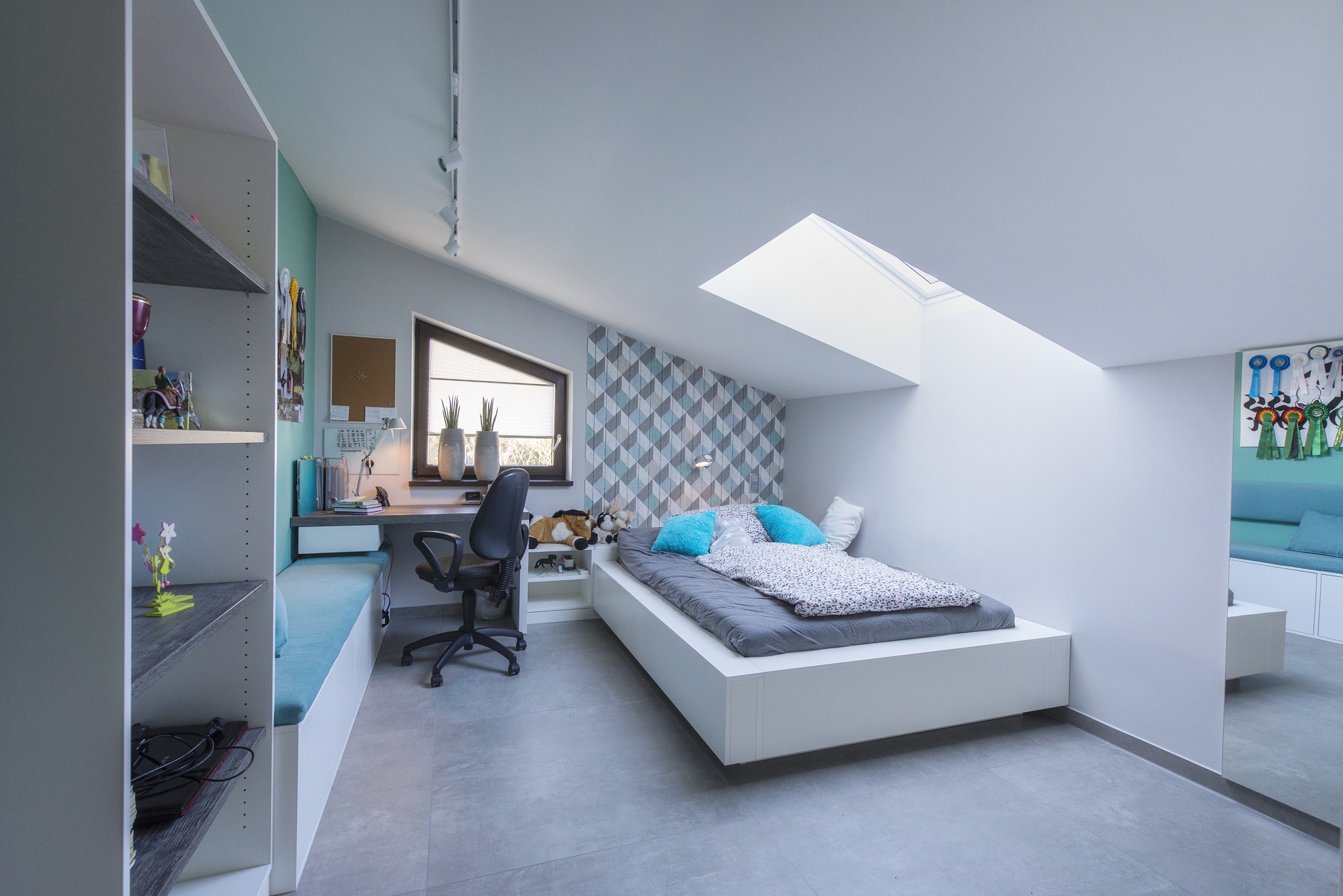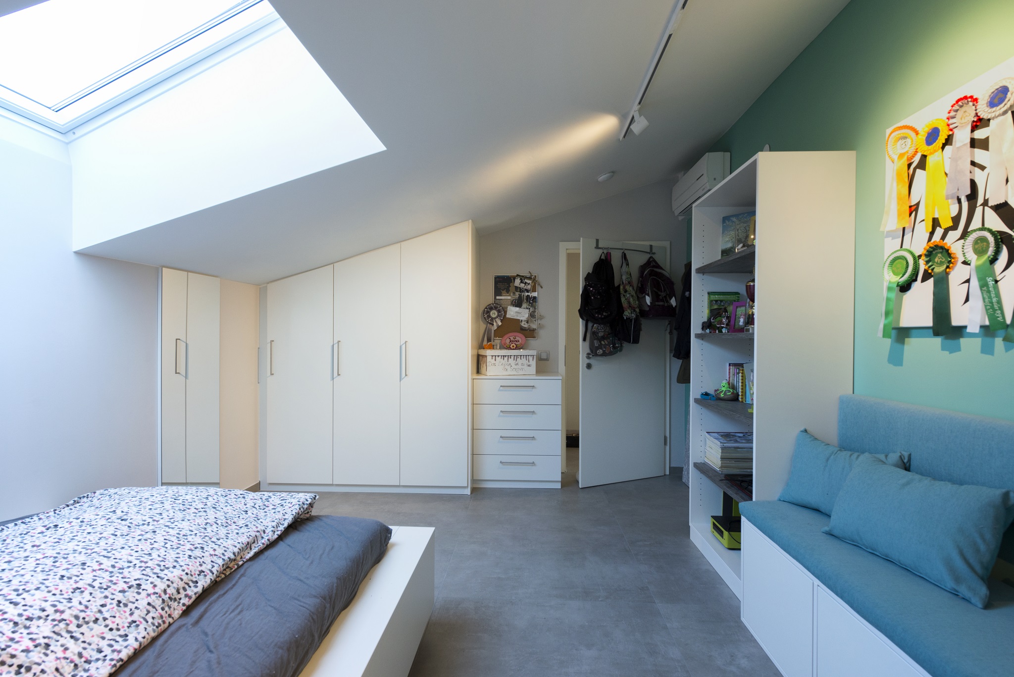 Das Kinderzimmer erstrahlt in frischen Farben. Maßmöbel nehmen sich gestalterisch zurück und sind unaufgeregt funktionell.