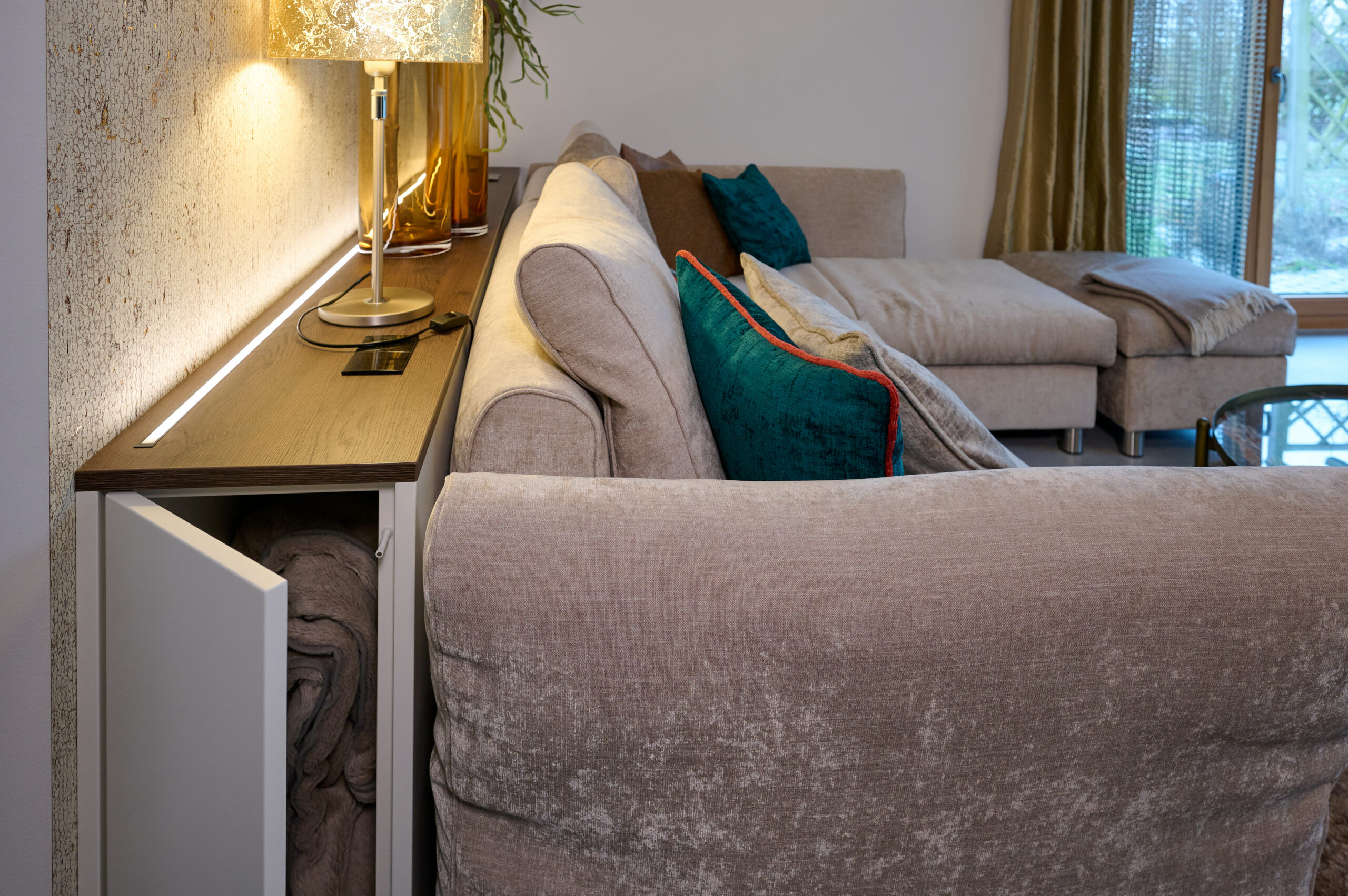 Man war offen für alles. Das ist die perfekte Grundlage für optimale Innenarchitektur-Gestaltung. Jedoch sind aufgrund der Architektur natürlich Grenzen gesetzt. Herausfordernd war in diesem Fall (wie so oft) die Position des TV-Geräts.