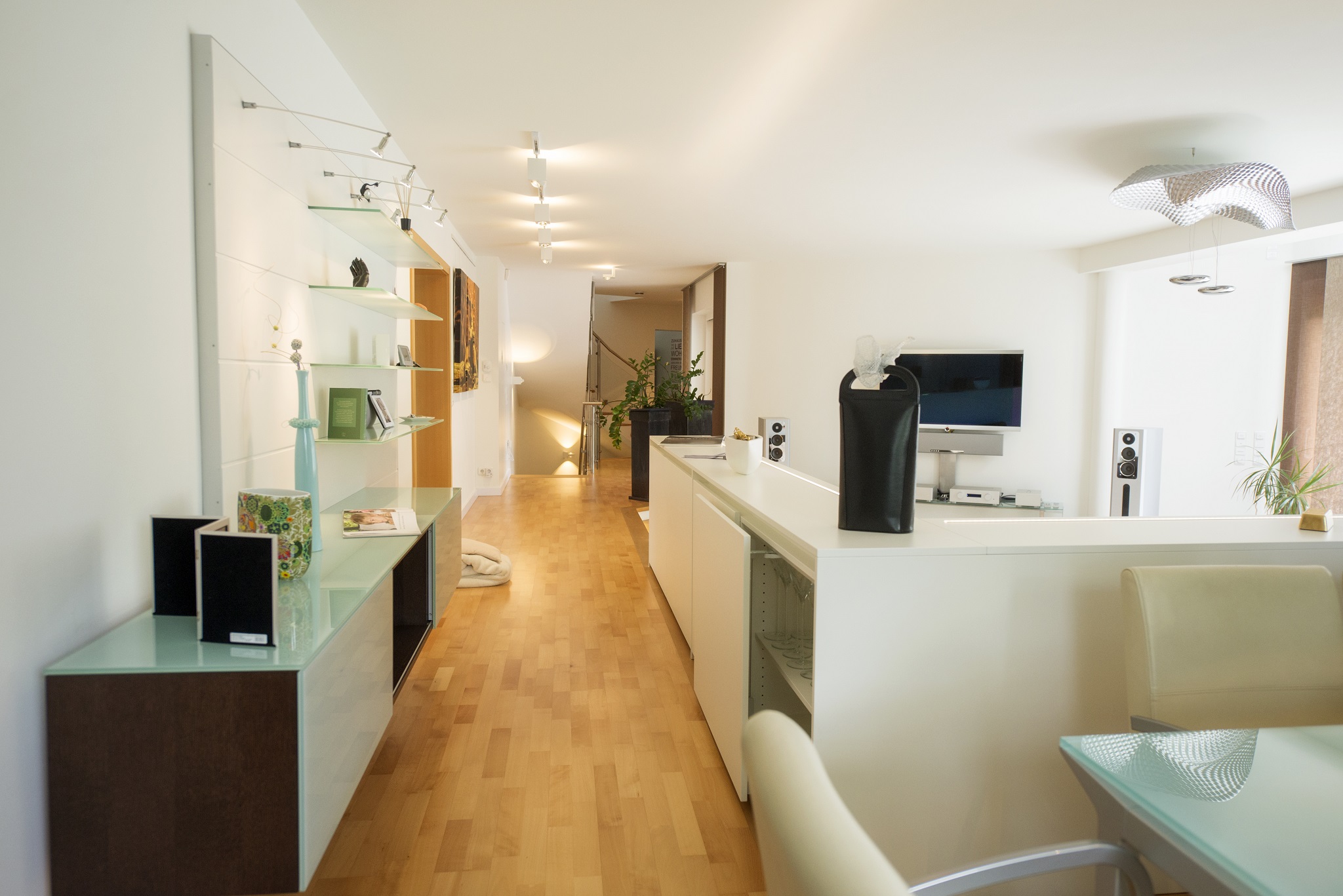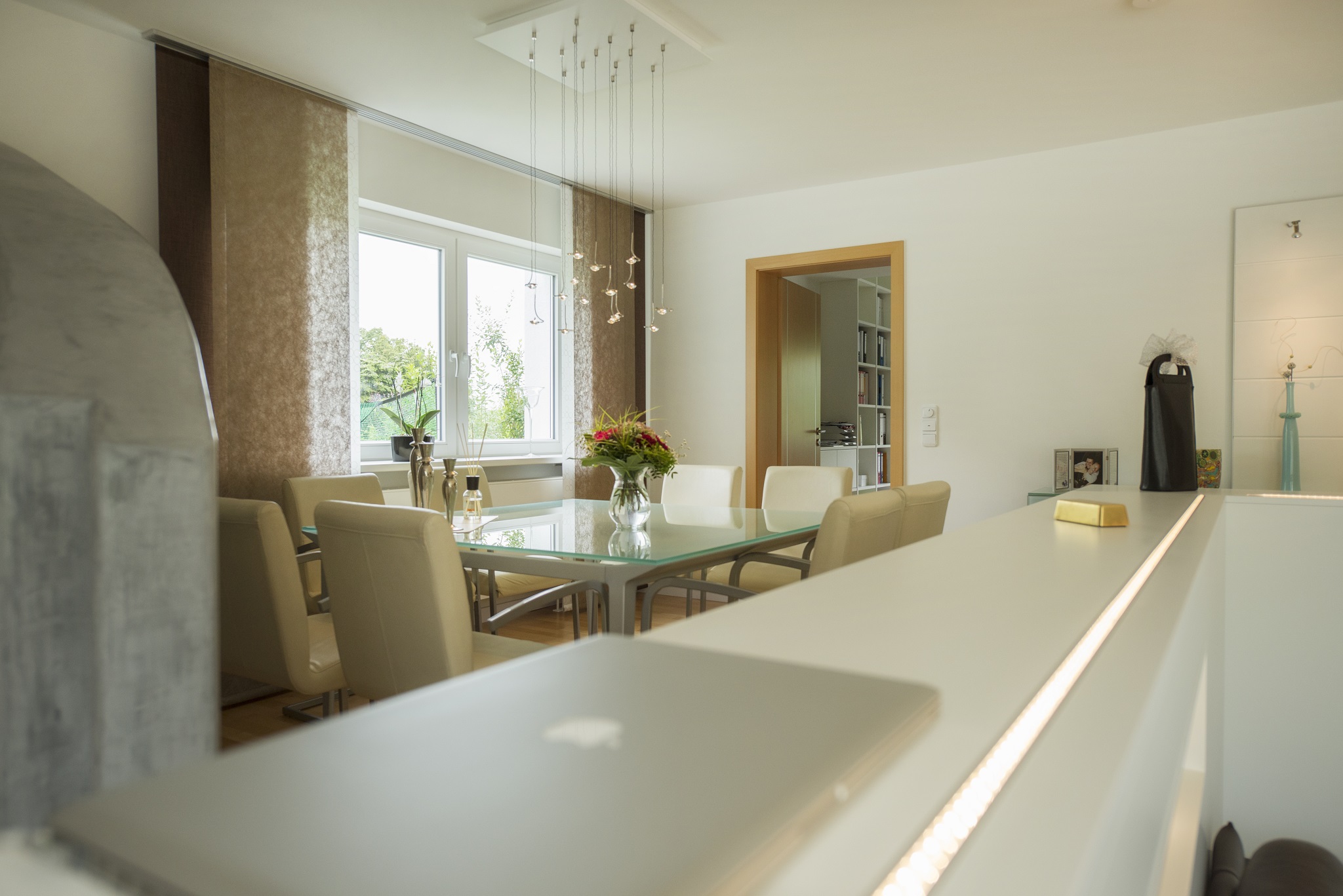 Eine vier-köpfige Familie mit Au-Pair vergrößerte ihren Wohnraum in Rathsberg von 200 auf knapp 400 Quadratmeter. Das neue Domizil hatte einen etwas schwierigen Schnitt; außerdem fand man einen wilden Mix an Farben und Materialien vor. Ich erhielt den Auftrag, für die gesamte Innenarchitektur des Hauses ein Konzept zu erstellen. Ich sollte einen Teil der vorhandenen Möbel (Couchmöbel, Essplatzmöbel) integrieren und das vom Grundriss her große Wohn-/Esszimmer optimal gestalten. Die Familie wünschte sich vor allem eine gemütliche Kaminecke – erste Kundenvorgabe war, mit zwei hochpreisigen Lederliegen zu arbeiten. Die Kunden gaben auch eine Farbgestaltung aus einer Kombination aus Weiß mit Naturtönen als Wunsch vor.