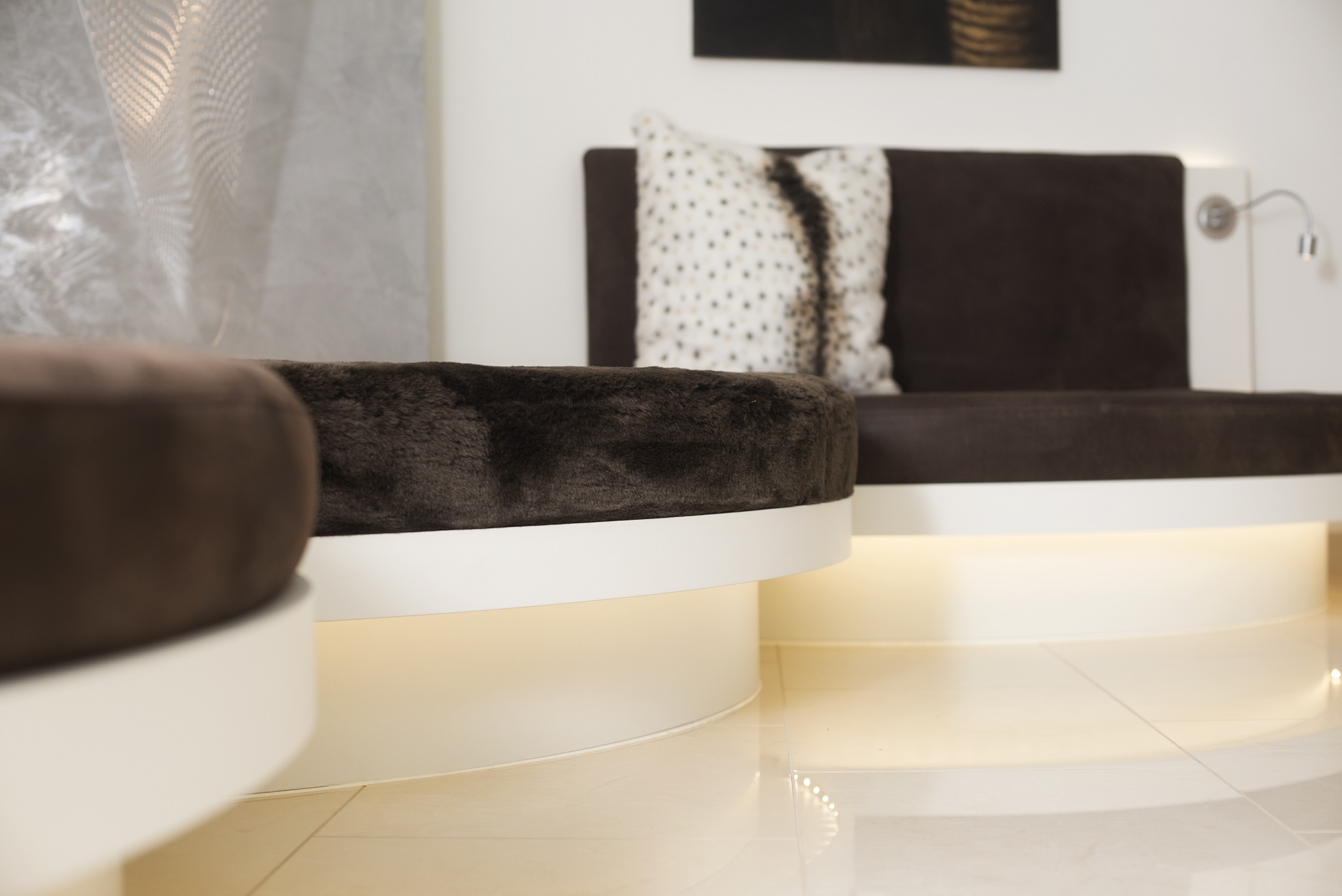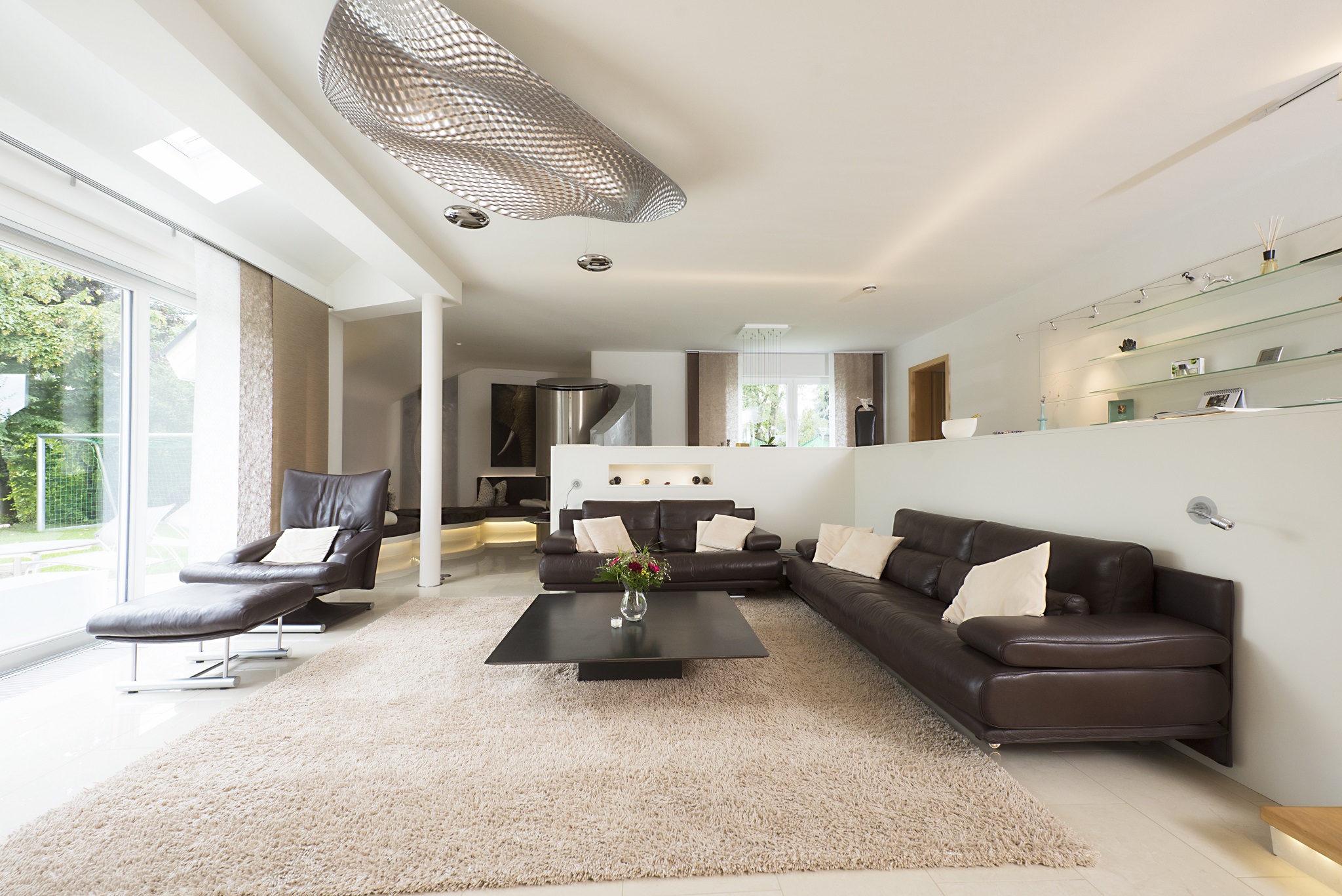 Die vorhandenen Möbel wurden so integriert, dass sie wirkten, als seien sie speziell für diesen Raum ausgewählt worden. Besonderer Clou in diesem XL-Wohnraum ist das selbst geplante Kaminpodest, das zum Relaxen einlädt. Auf die geplanten Lederliegen zu verzichten, fiel den Kunden zunächst schwer, die neue Lösung in Idee und Ausführung jedoch überzeugte sie.