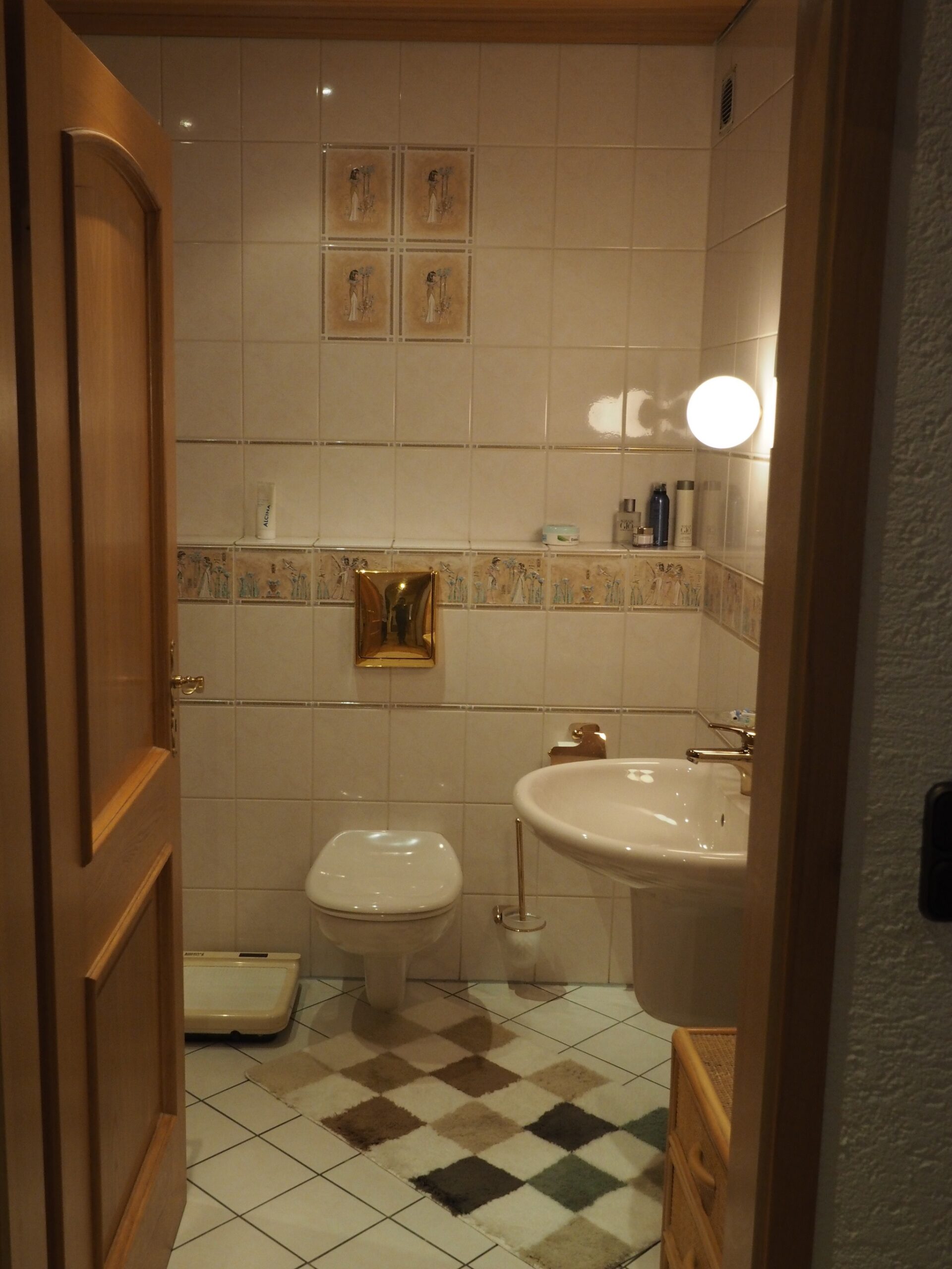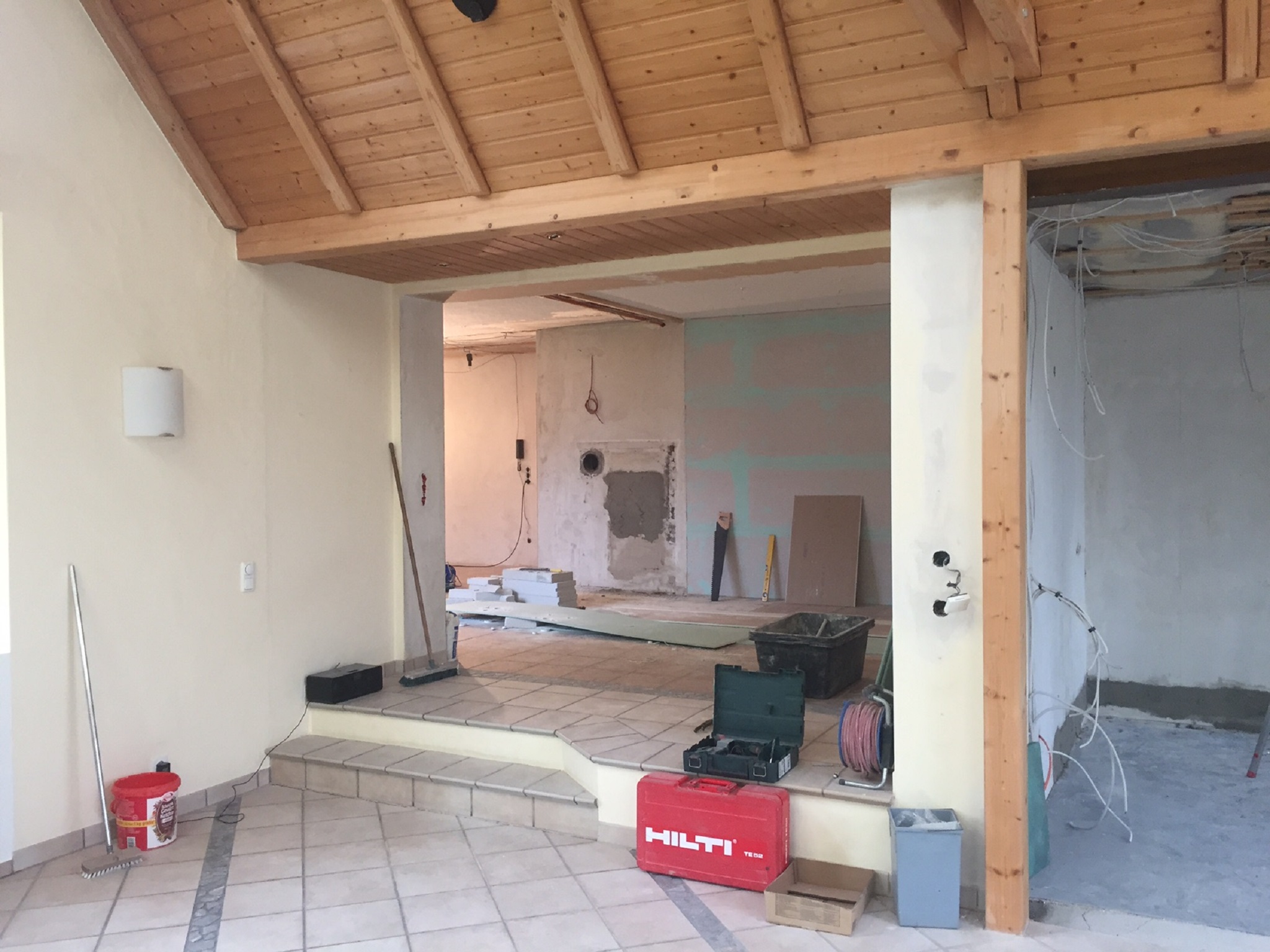 Wir haben hier wirklich eine richtig große Veränderung durchgeführt. Das kleine Gäste-WC wurde mit dem daneben liegenden Badezimmer zusammengelegt. Der Kaminofen wurde komplett erneuert.